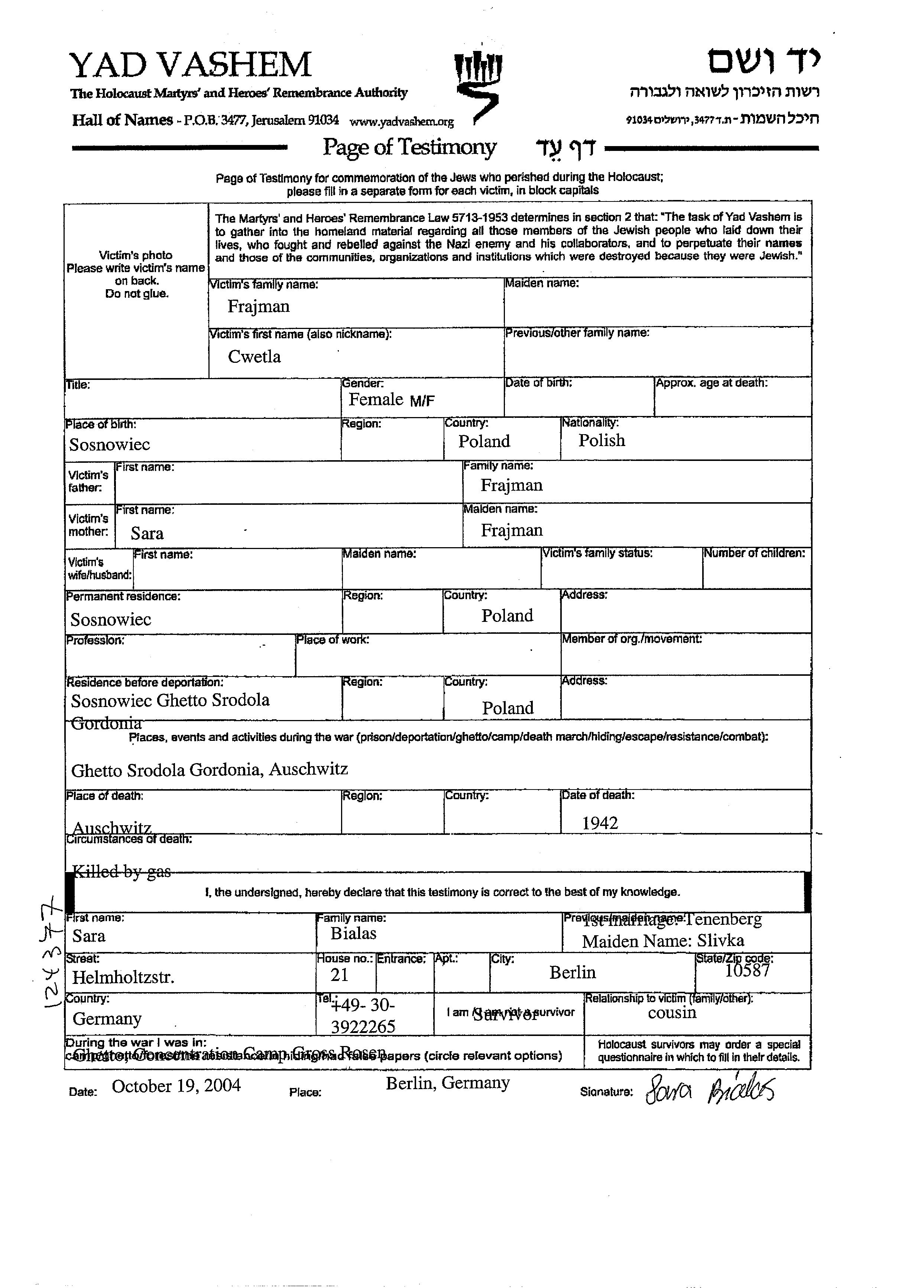 Aufenthaltsort während des Krieges/Schoah