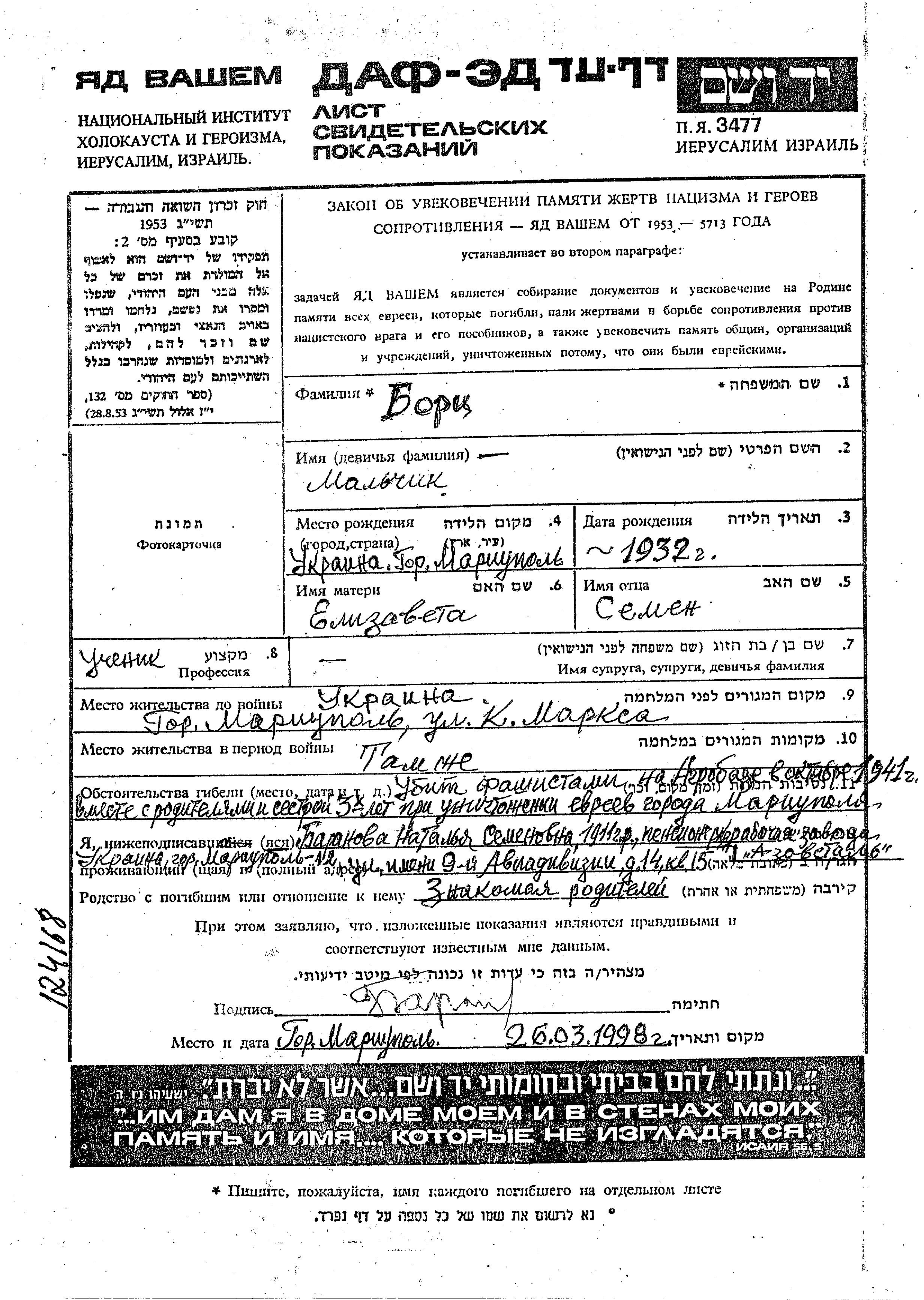 Vorname unbekannt Bortz wurde im Jahr 1932 in Mariupol, Ukraine (UdSSR) geboren. Er war der Sohn von Semyon und Yelizaveta. Er war Kind. Vor dem Zweiten Weltkrieg lebte er in Mariupol, Ukraine (UdSSR). Während des Krieges war er in Mariupol, Ukraine (UdSSR).