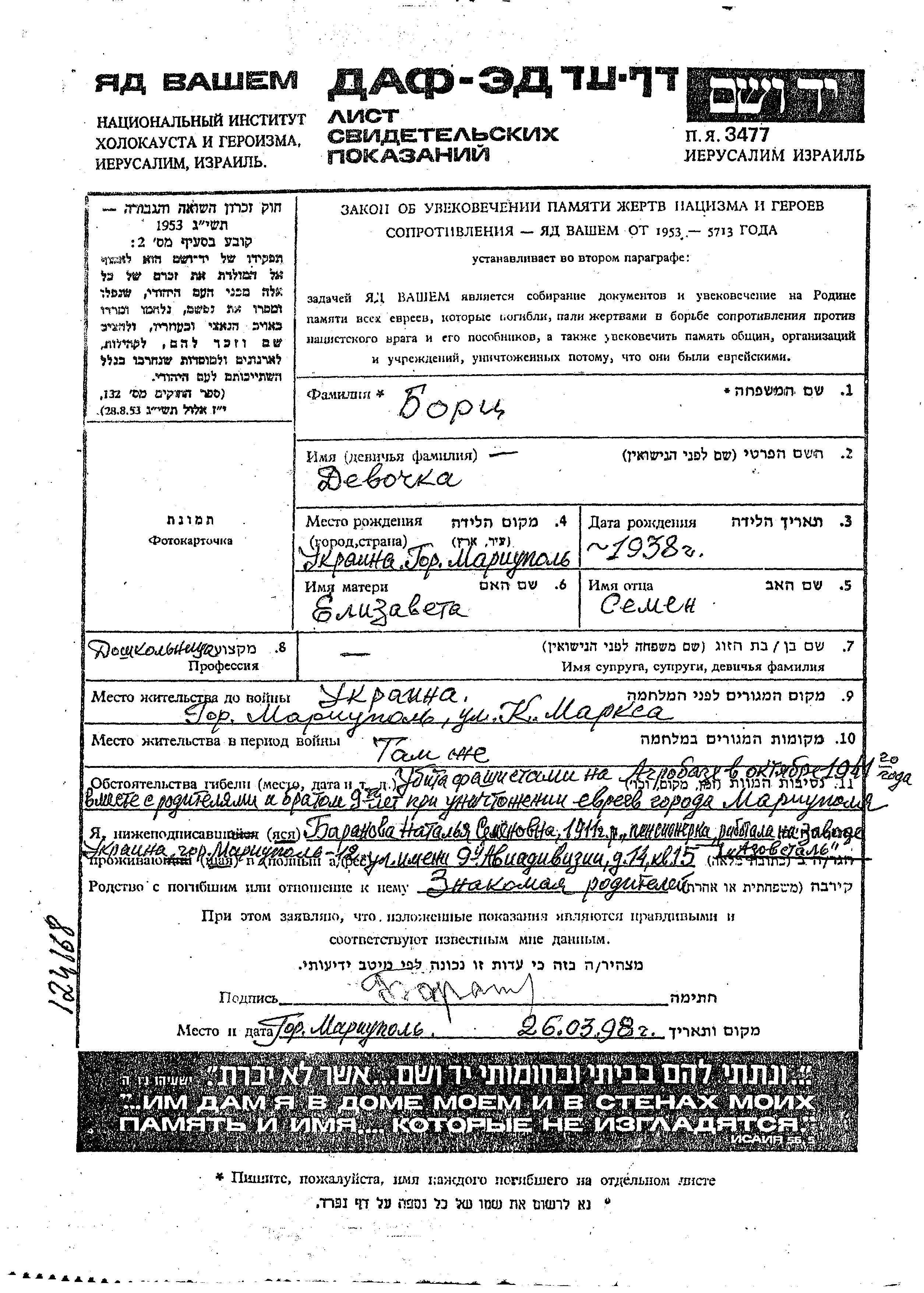 Bortz Vorname unbekannt 1938 Mariupol, Ukraine (UdSSR) Gedenkblatt
