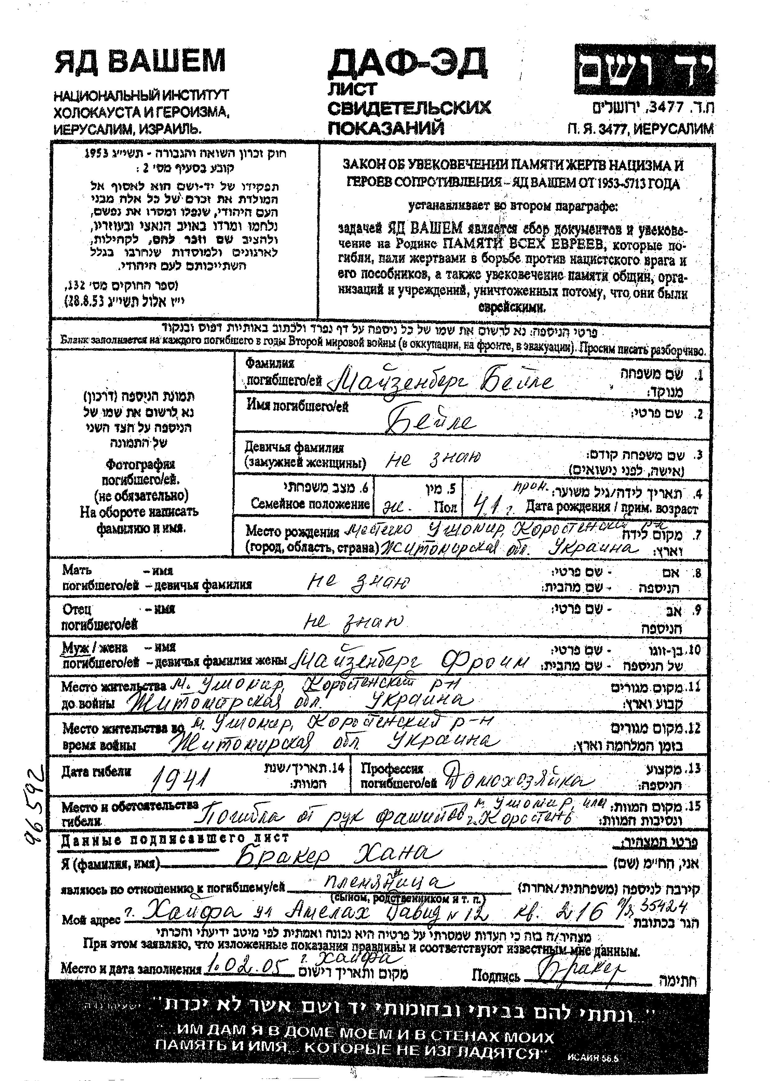 Beile Maizenberg wurde in Ushomir, Ukraine (UdSSR) geboren. Sie war mit Froim Verheiratet. Vor dem Zweiten Weltkrieg lebte sie in Ushomir, Ukraine (UdSSR). Während des Krieges war sie in Ushomir, Ukraine (UdSSR).