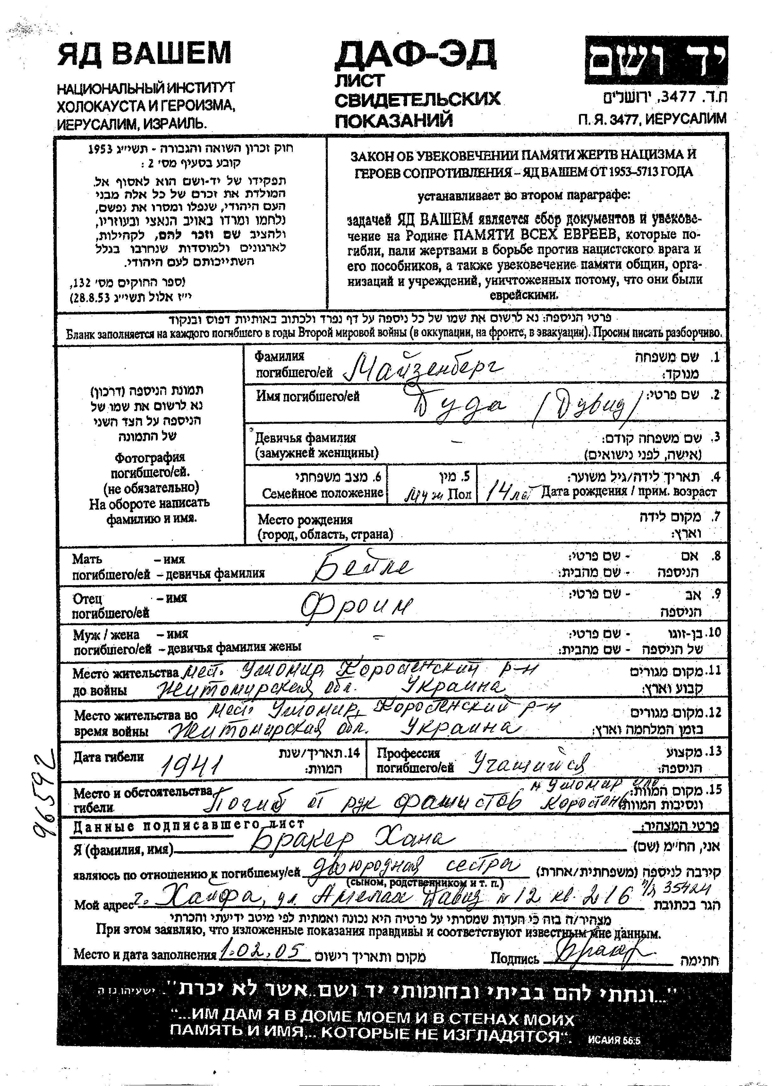 Duda Maizenberg wurde Er war der Sohn von Beile und Froim. Er war Jugendliche/-r. Vor dem Zweiten Weltkrieg lebte er in Ushomir, Ukraine (UdSSR). Während des Krieges war er in Ushomir, Ukraine (UdSSR).