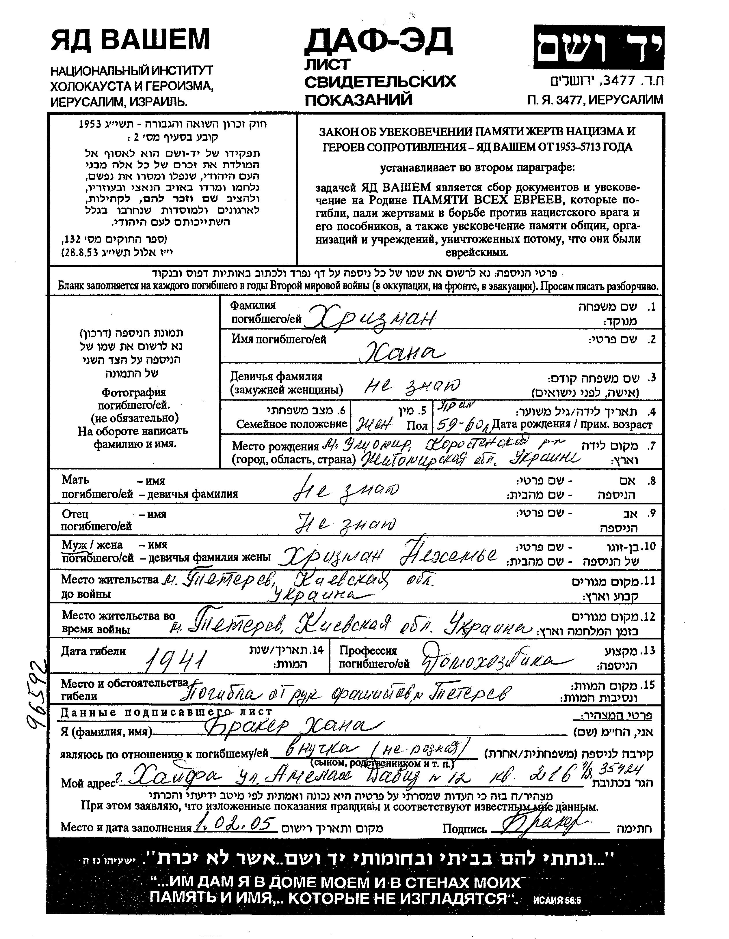 Khana Khrizman wurde in Ushomir, Ukraine (UdSSR) geboren. Sie war Verheiratet. Vor dem Zweiten Weltkrieg lebte sie in Teterev, Ukraine (UdSSR). Während des Krieges war sie in Teterev, Ukraine (UdSSR).