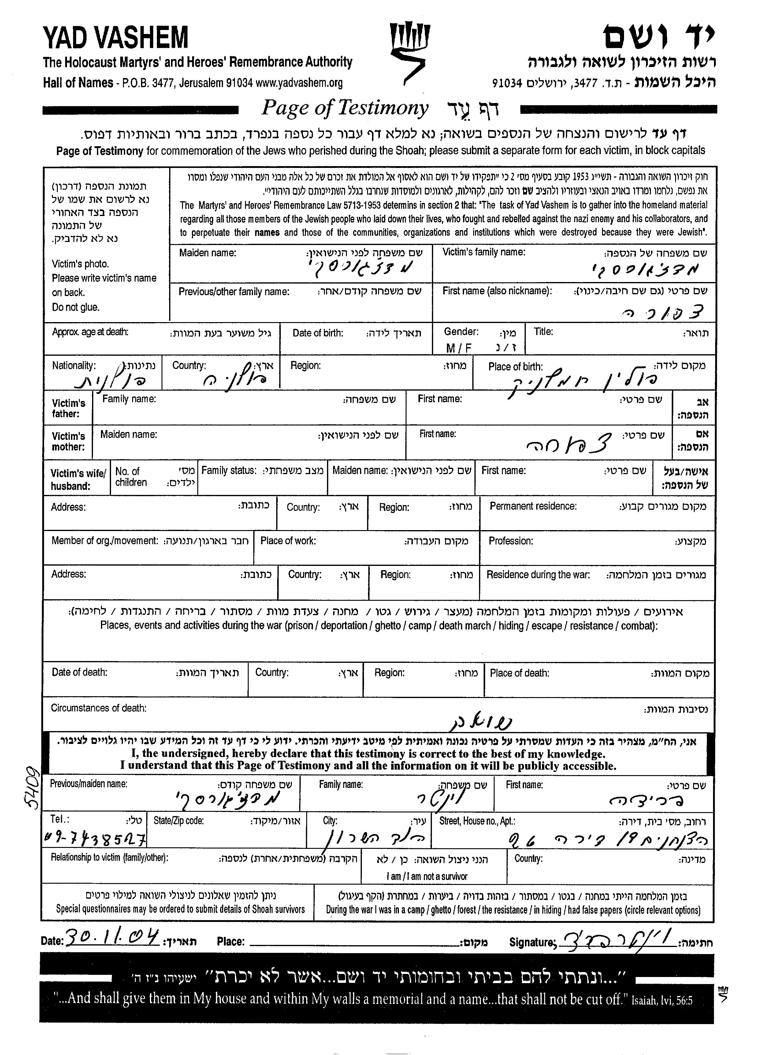 Medzigurski Tzipora unbekannter Ort, Gedenkblatt