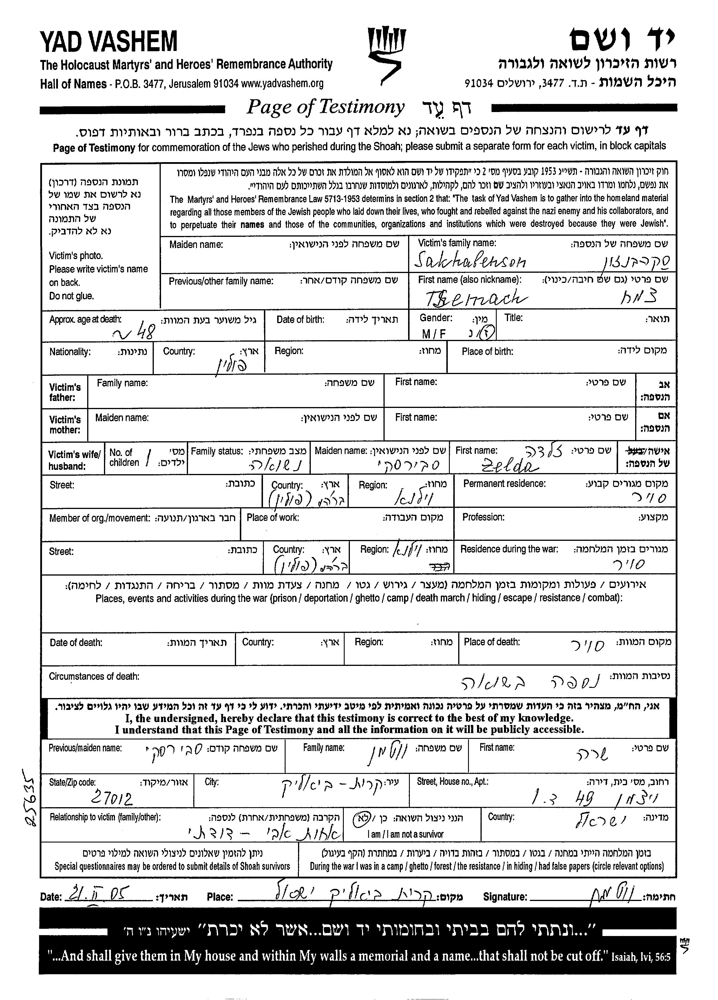 סקהבנזון Tzemakh Swir, Polen Gedenkblatt