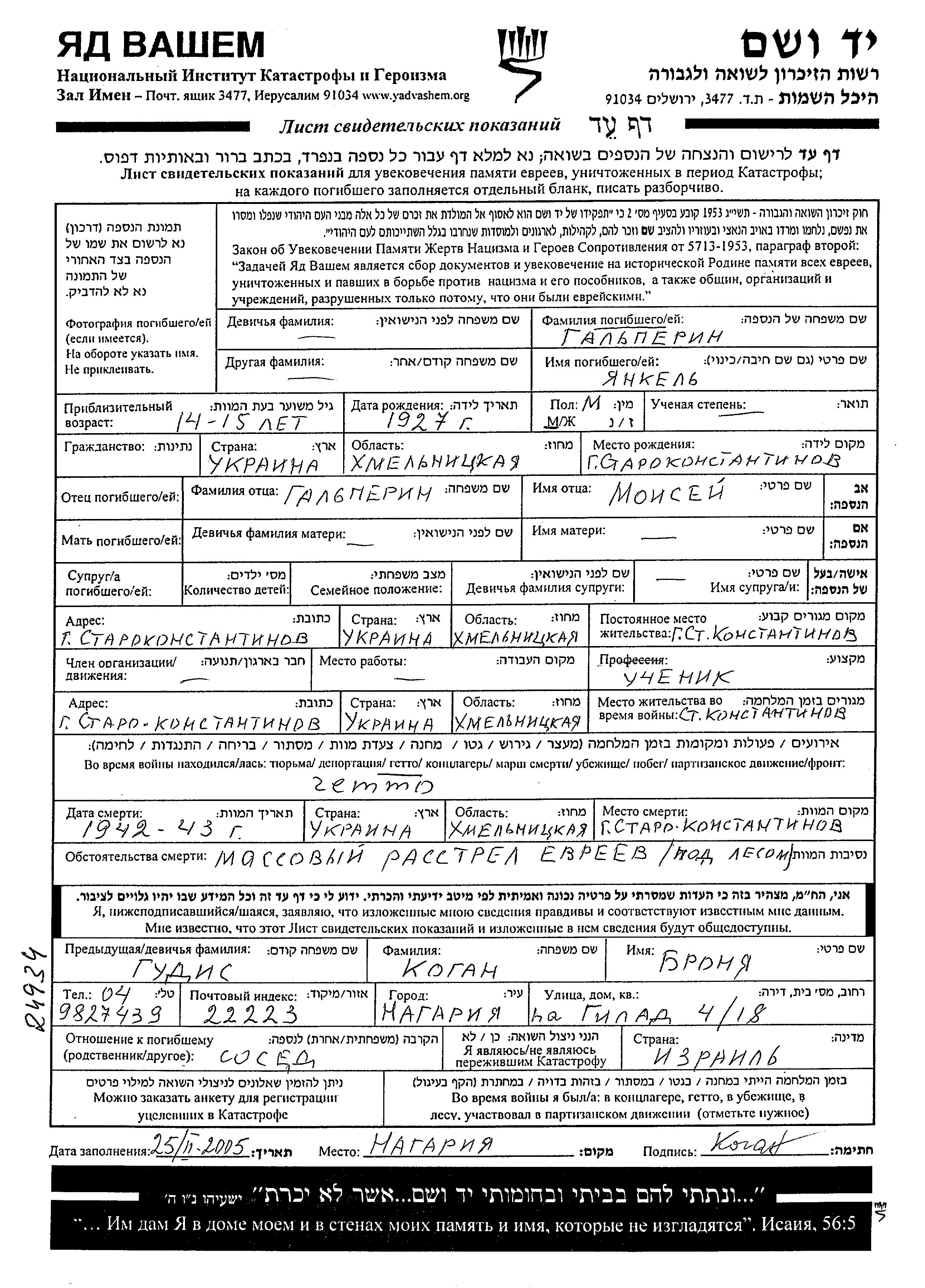 Yankel Galperin wurde im Jahr 1927 in Starokonstantinov, Ukraine (UdSSR) geboren. Er war der Sohn von Moisei. Er war Jugendliche/-r. Vor dem Zweiten Weltkrieg lebte er in Starokonstantinov, Ukraine (UdSSR). Während des Krieges war er in Getto.