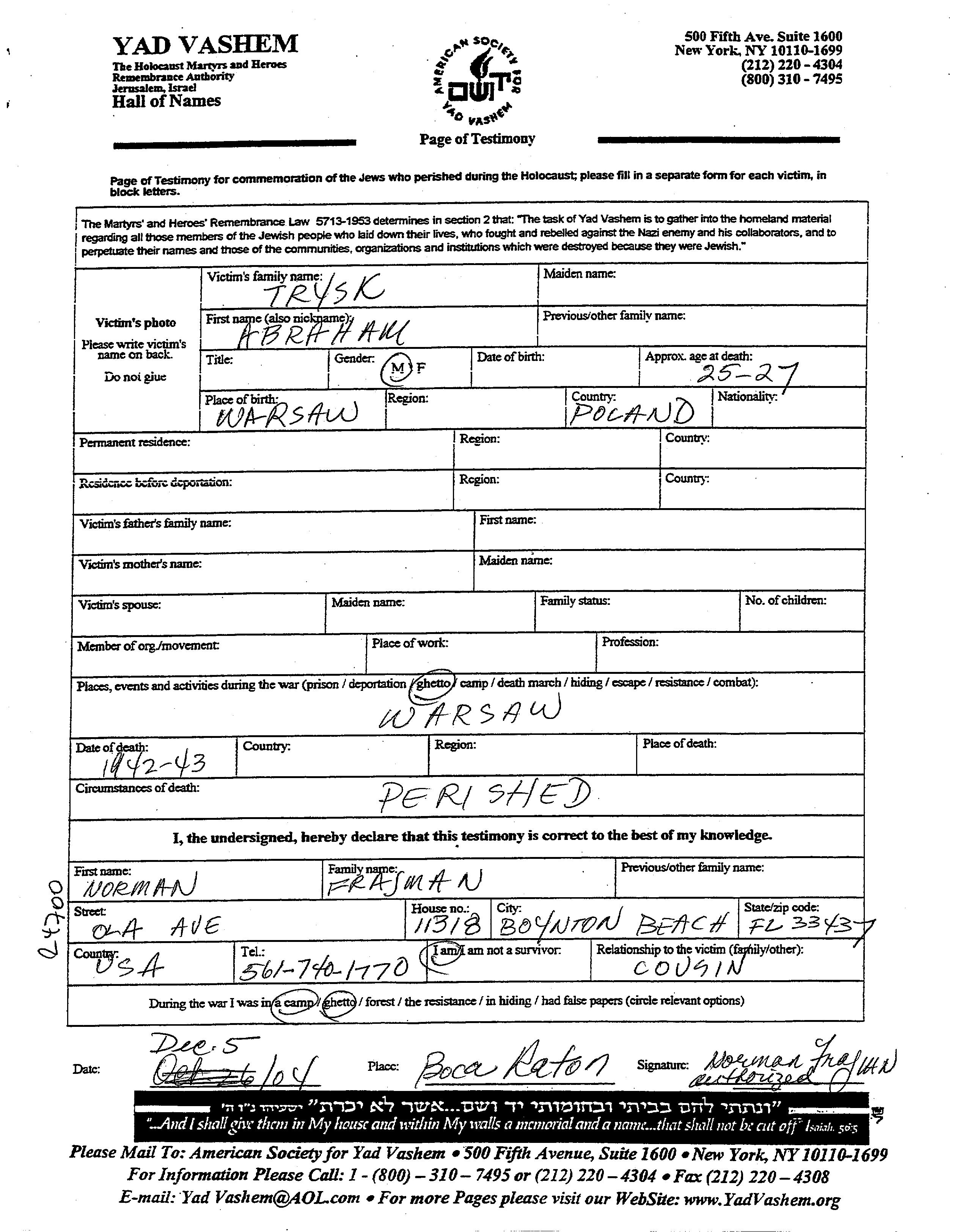 Abraham Trysk wurde in Warszawa, Polen geboren. Während des Krieges war er in Warszawa, Polen.