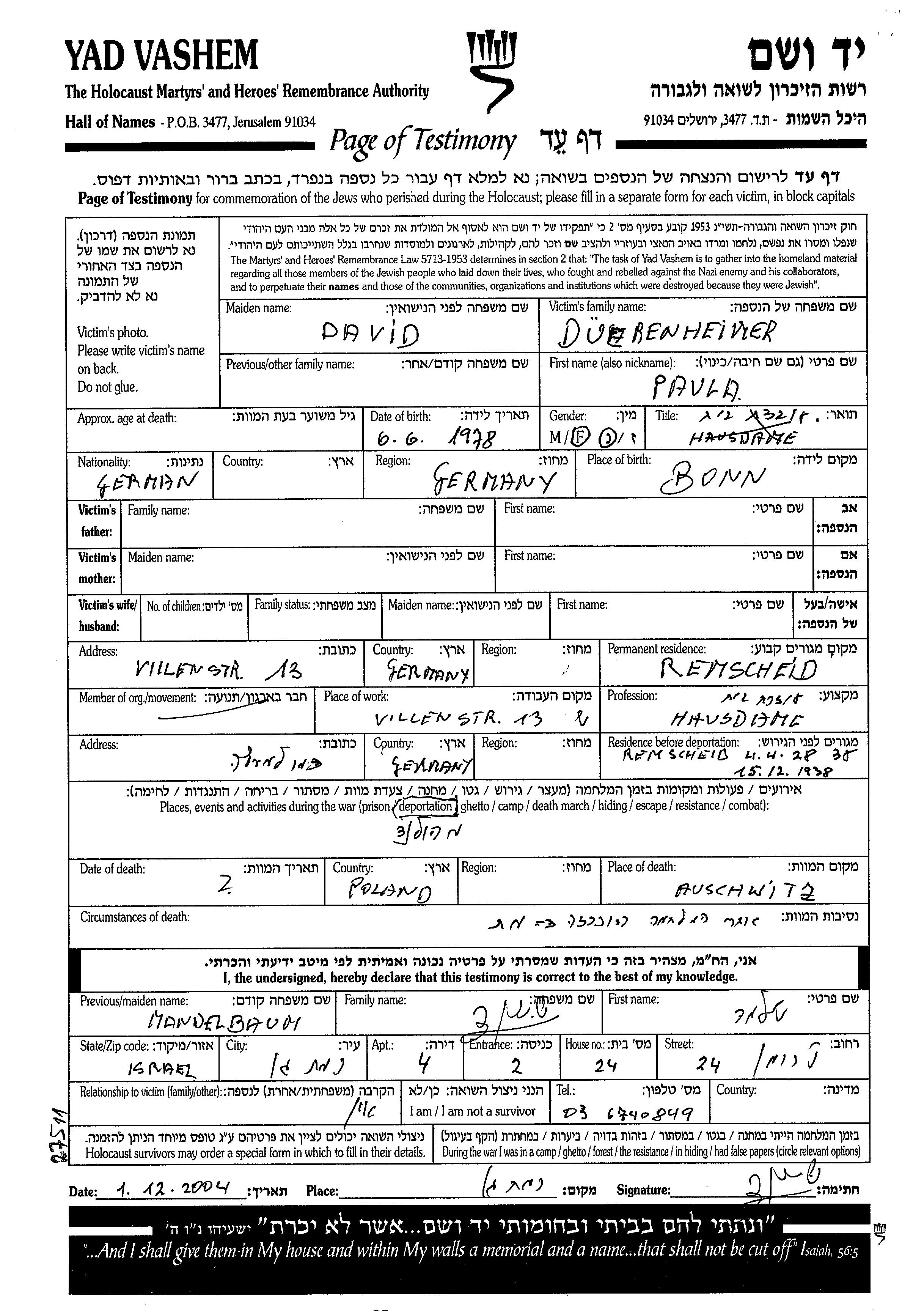 Paula Duerenheimer, geb. David wurde im Jahr 1878 in Bonn, Deutsches Reich geboren. Vor dem Zweiten Weltkrieg lebte sie in Remscheid, Deutsches Reich. Während des Krieges war sie in Remscheid, Deutsches Reich.