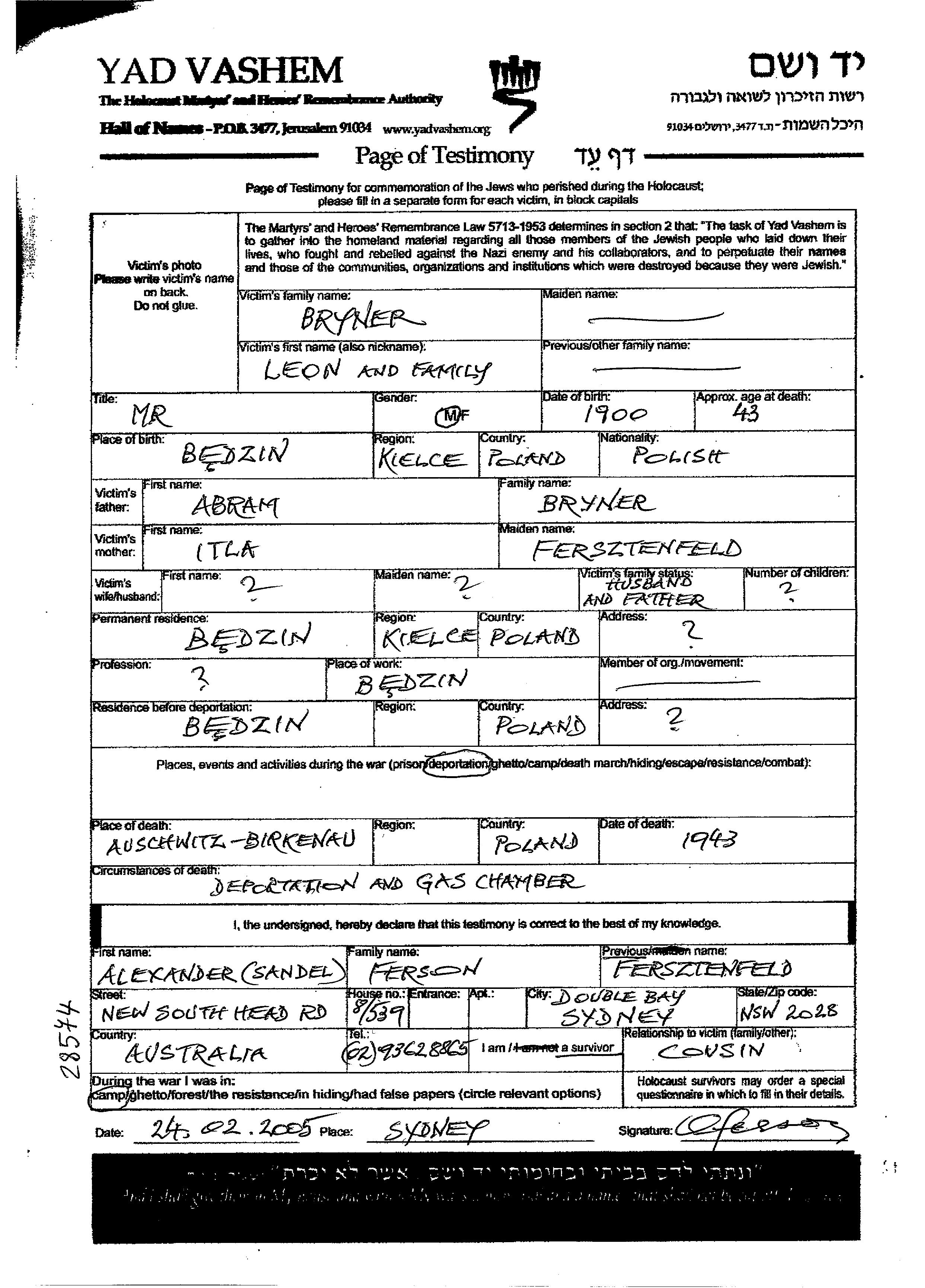 Leon Bryner wurde im Jahr 1900 in Będzin, Polen geboren. Er war der Sohn von Abram und Itla, geb. Fersztenfeld. Er war Verheiratet. Vor dem Zweiten Weltkrieg lebte er in Będzin, Polen. Während des Krieges war er in Będzin, Polen.