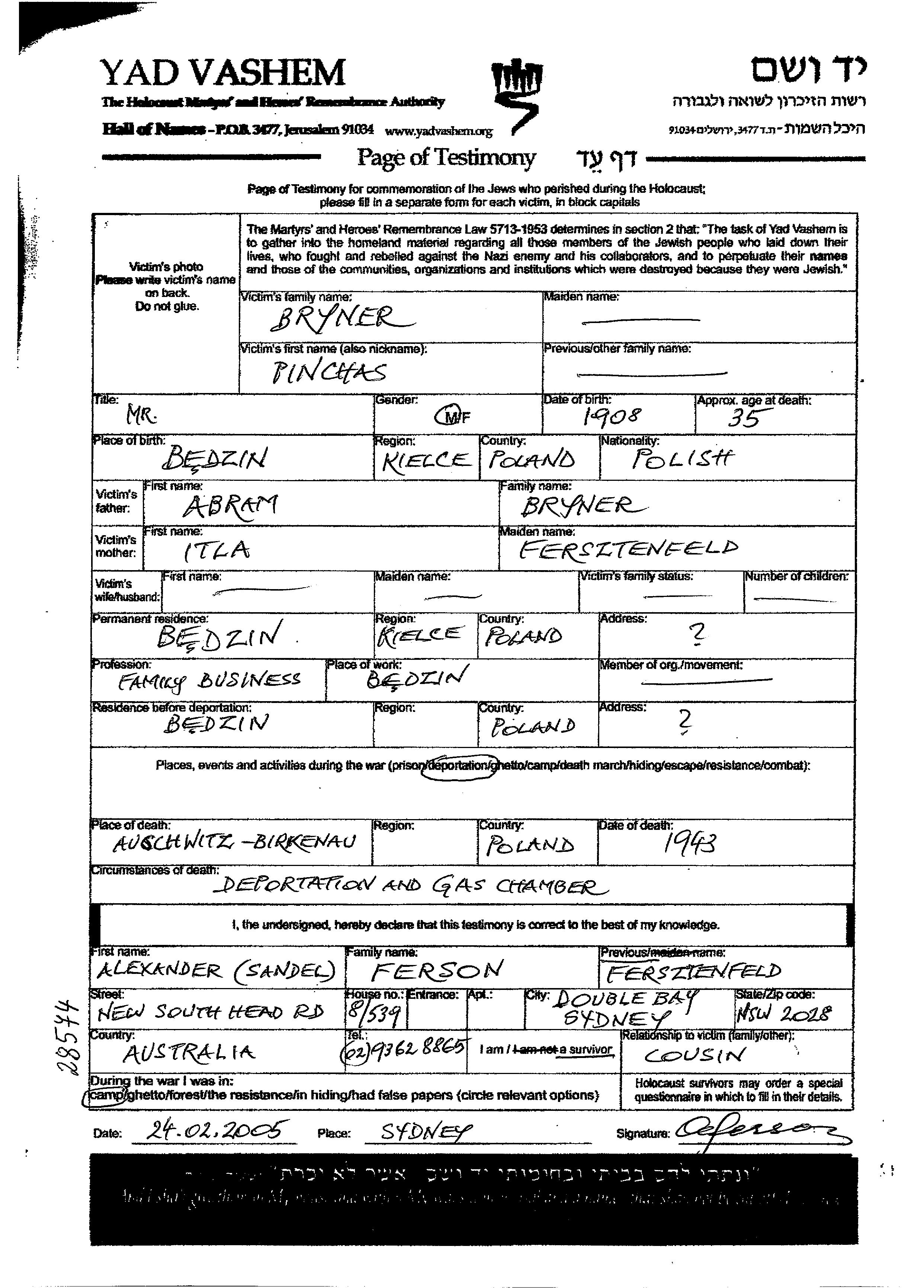 Bryner Pinchas 1908 Będzin, Polen Gedenkblatt