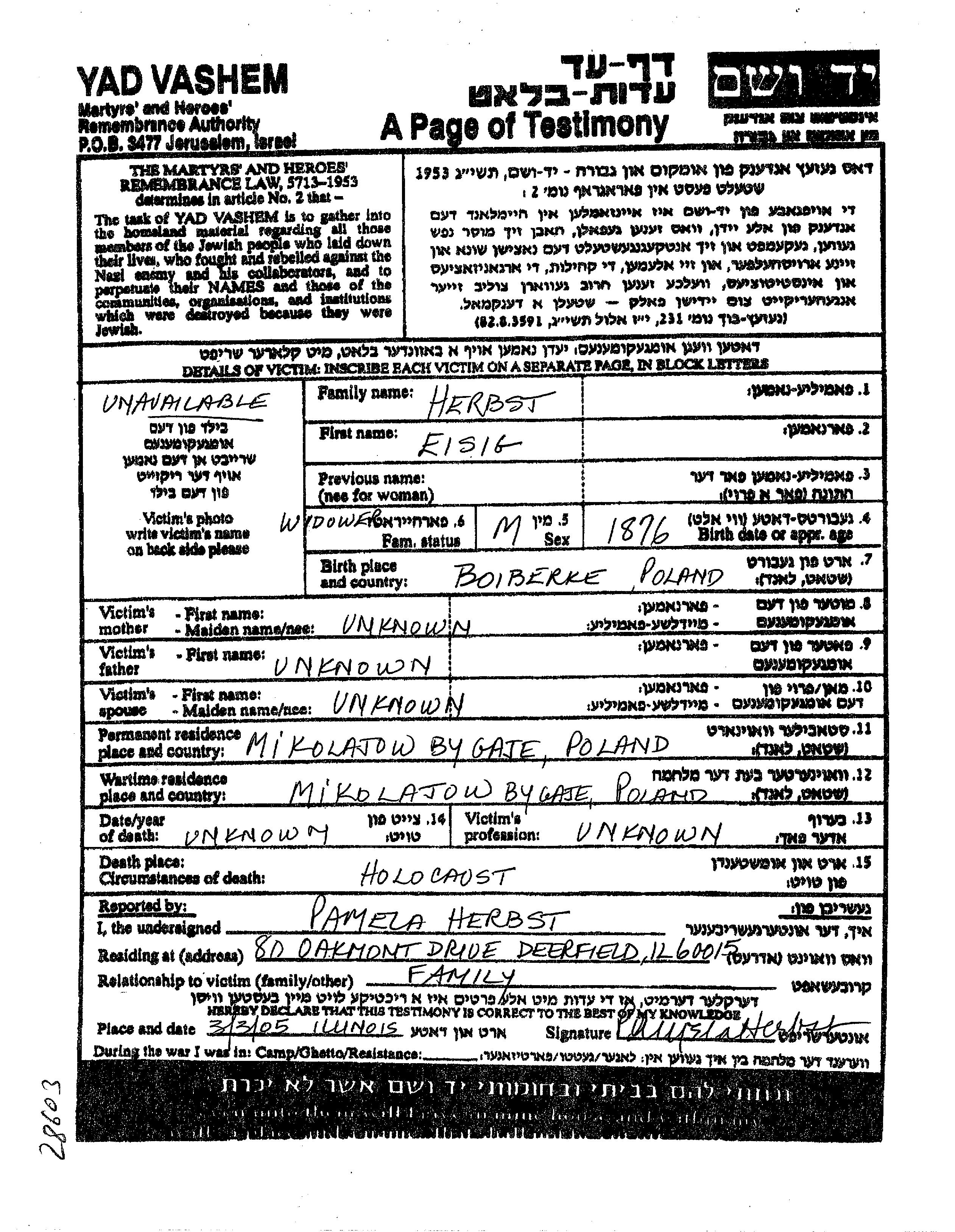 Eisig Herbst wurde im Jahr 1876 in Boiberik, Polen geboren. Er war Witwer. Vor dem Zweiten Weltkrieg lebte er in Mikolajow Gajow, Polen. Während des Krieges war er in Mikolajow Gajow, Polen.