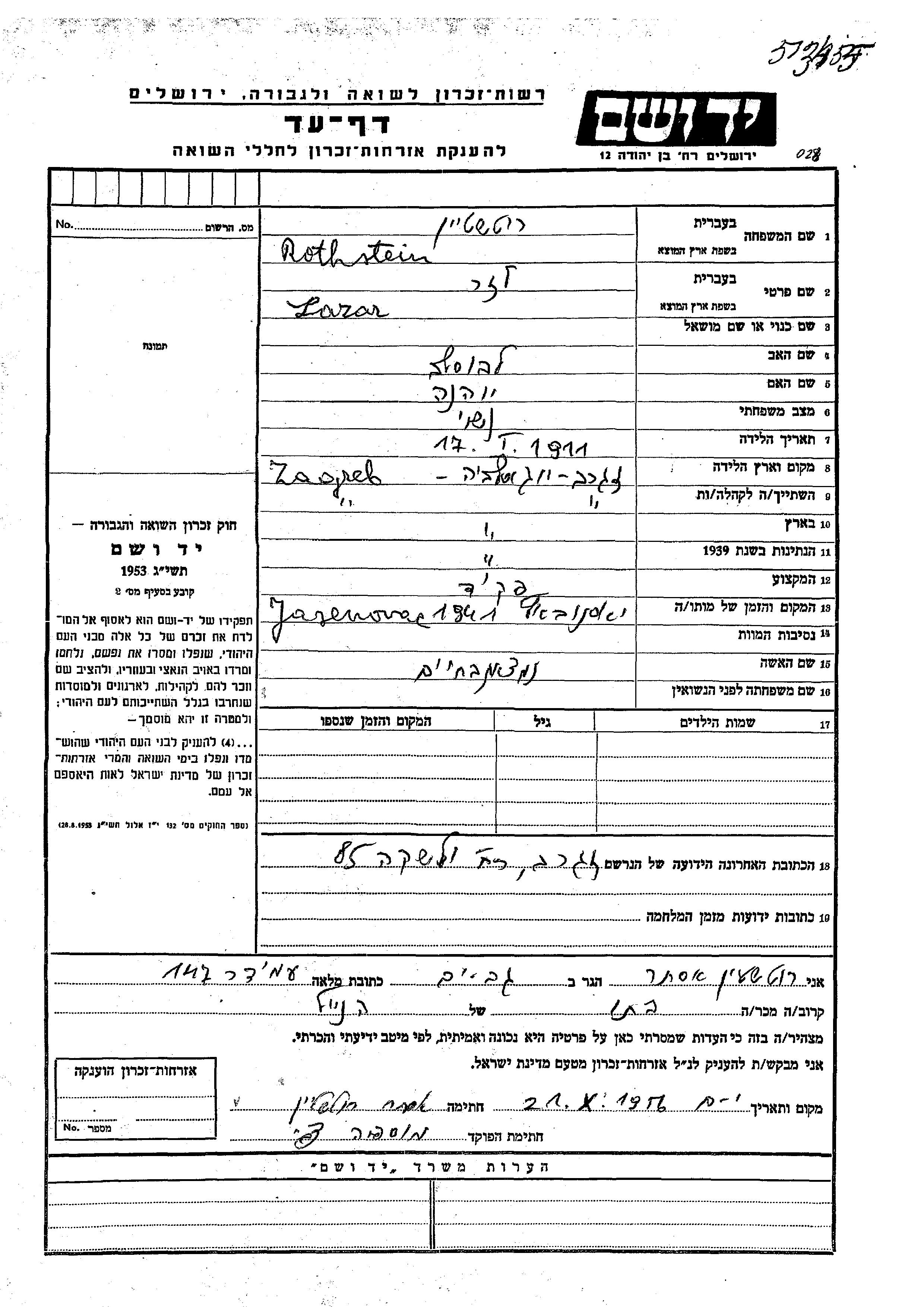 Lazar Rothstein wurde im Jahr 1911 in Zagreb, Jugoslawien geboren. Er war der Sohn von Lawoslav und Yohana. Er war Angestellte/-r. Vor dem Zweiten Weltkrieg lebte er in Zagreb, Jugoslawien. Während des Krieges war er in Zagreb, Jugoslawien.