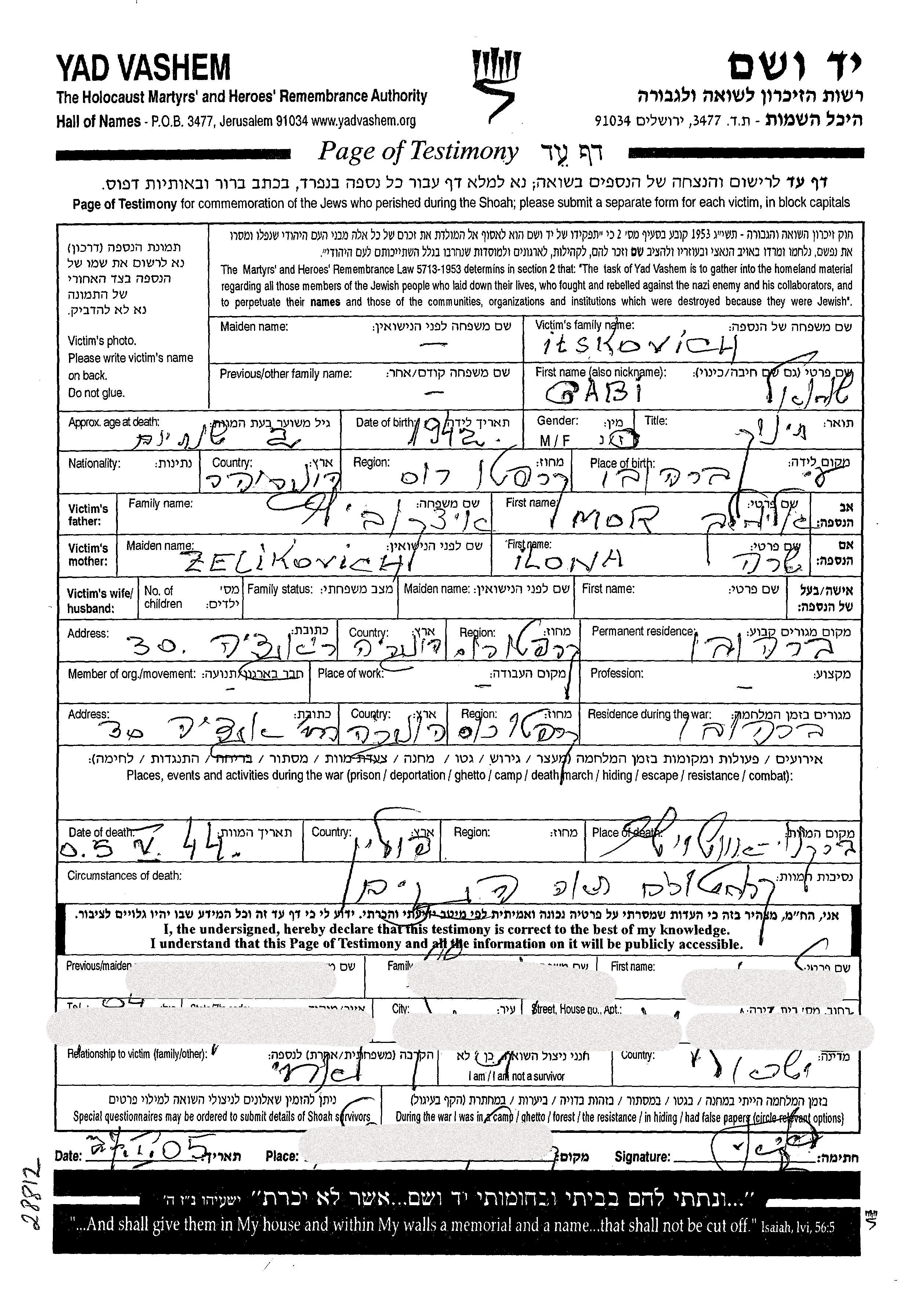 Shmuel Gabi Itskovich wurde im Jahr 1942 in Carpathian Ruthenia, Tschechoslowakei geboren. Er war der Sohn von Mor Elimelekh und Ilona Sara, geb. Zelikovich. Er war Säugling. Vor dem Zweiten Weltkrieg lebte er in Berehovo, Tschechoslowakei. Während des Krieges war er in Berehovo, Tschechoslowakei.