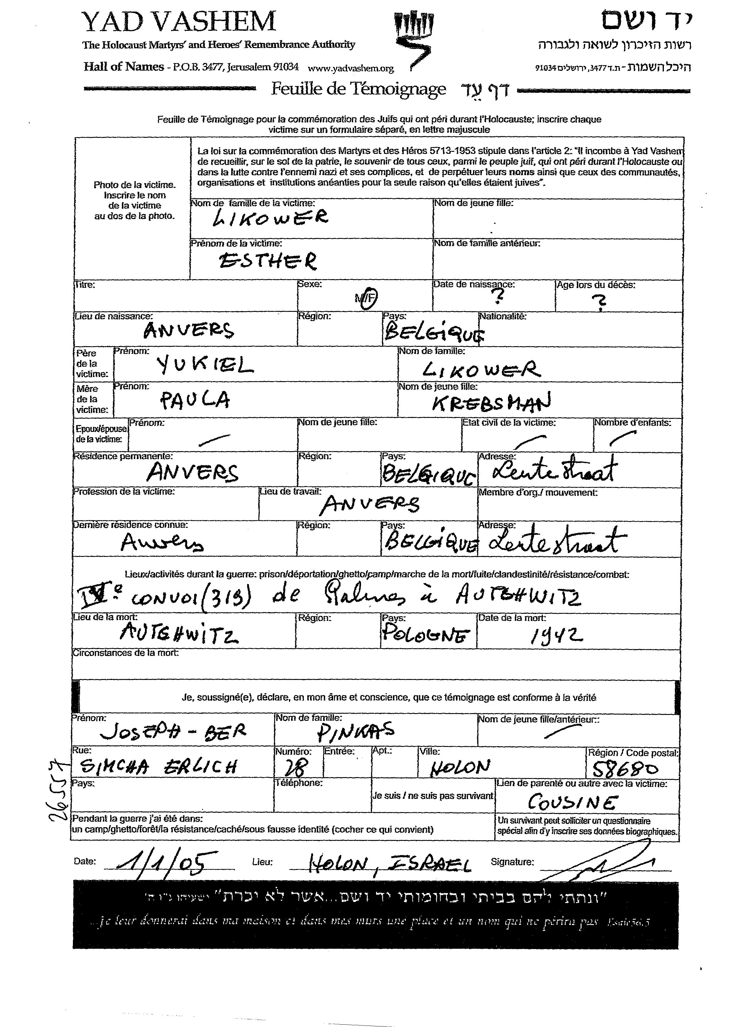 Aufenthaltsort während des Krieges/Schoah