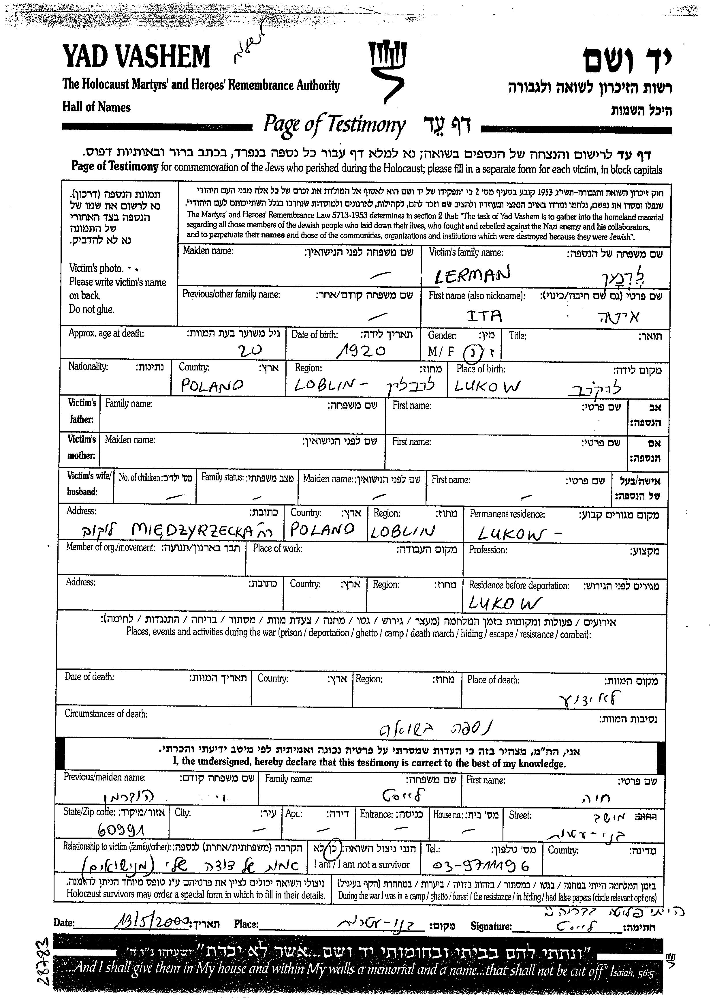 Ita Lerman wurde im Jahr 1920 in Lukow, Polen geboren. Vor dem Zweiten Weltkrieg lebte sie in Lukow, Polen. Während des Krieges war sie in Lukow, Polen.
