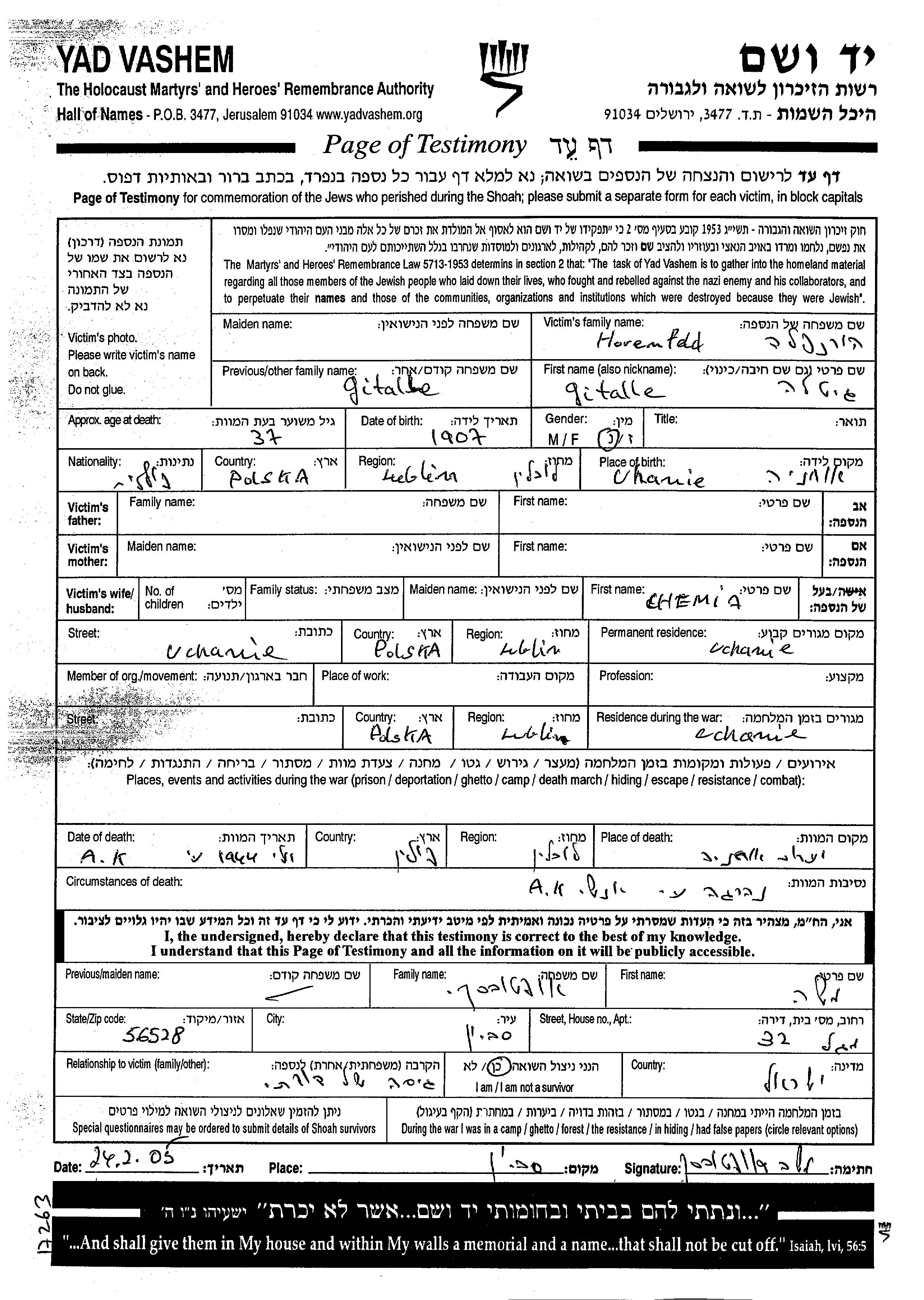 Gitla Horenfld wurde im Jahr 1907 in Uhanie, Polen geboren. Sie war mit Chemia Verheiratet. Vor dem Zweiten Weltkrieg lebte sie in Uhanie, Polen. Während des Krieges war sie in Uhanie, Polen.