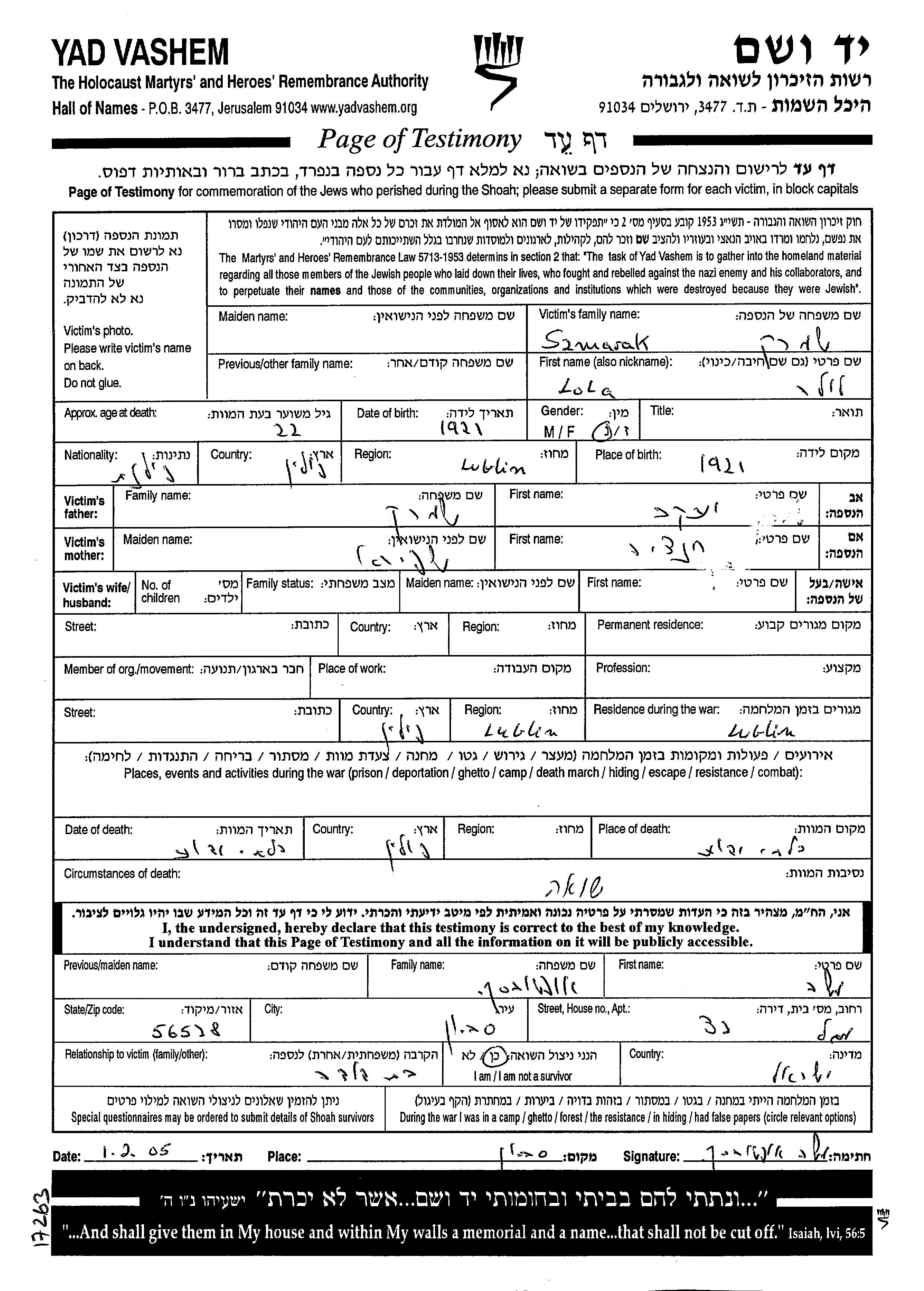 Lola Shmarak wurde im Jahr 1921 in Lublin, Polen geboren. Sie war die Tochter von Yaakov und Khana, geb. Shpigel. Während des Krieges war sie in Lublin, Polen.