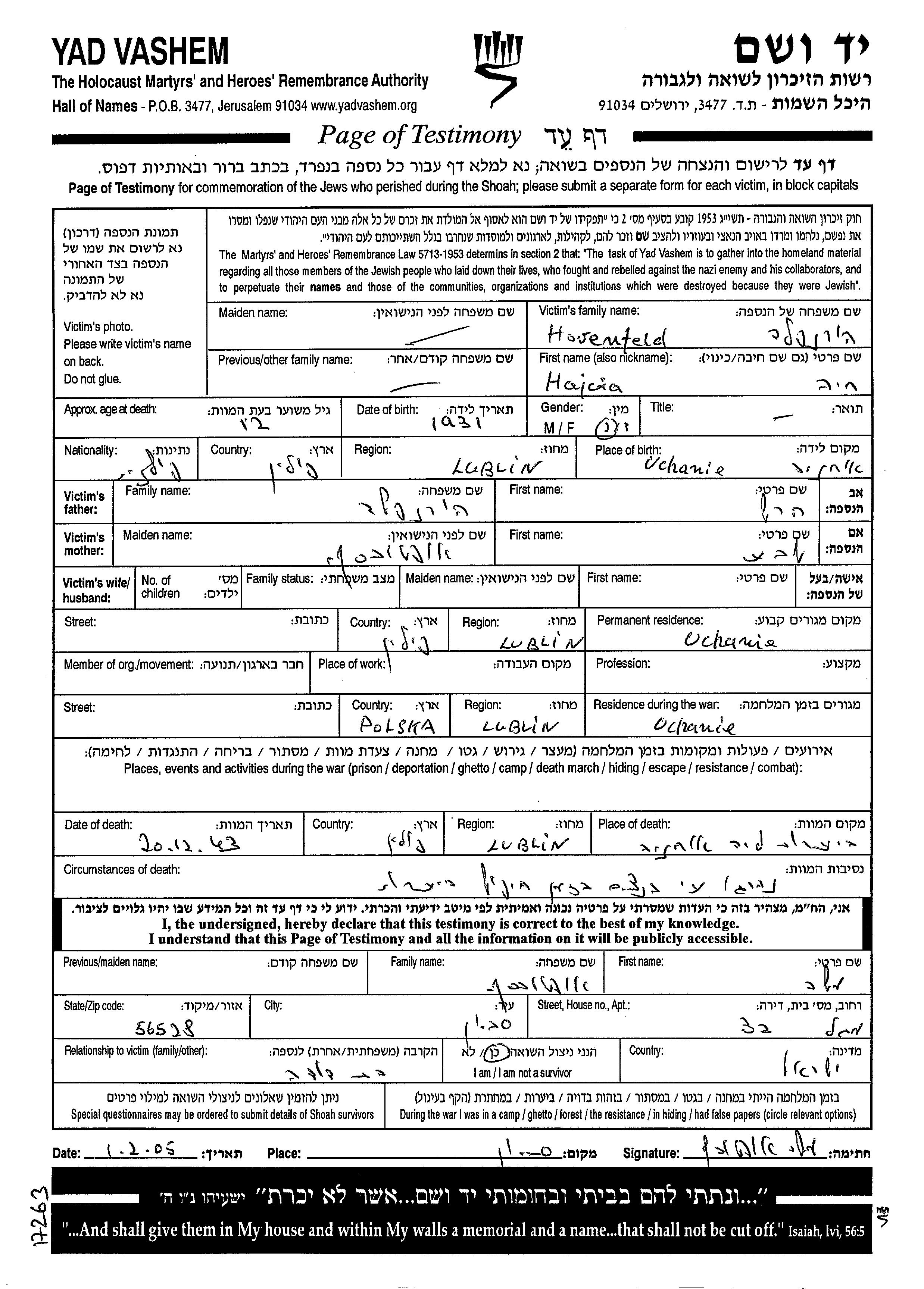 Hajcia wurde in der Schoah ermordet. Todesort: Uchanie, Polen im Jahr 20/12/1943.