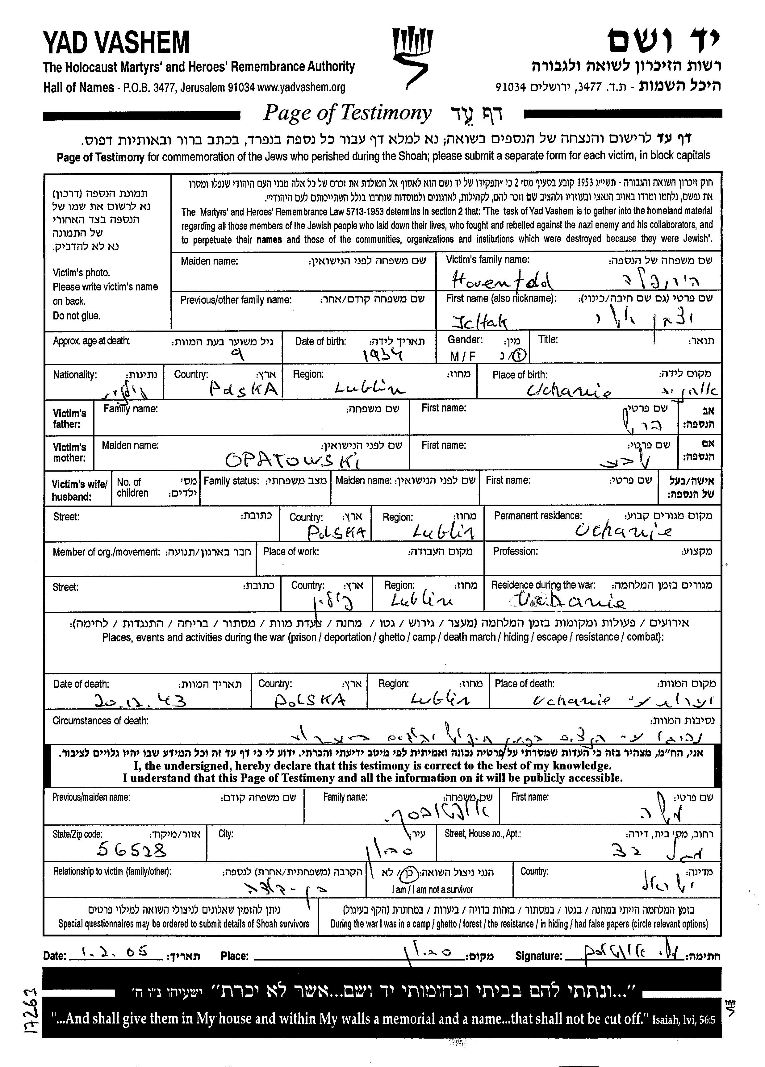 Asher Yitzkhak Hornfeld wurde im Jahr 1934 in Uchanie, Polen geboren. Er war der Sohn von Beresh und Sheva, geb. Opatowski. Er war Kind. Vor dem Zweiten Weltkrieg lebte er in Uchanie, Polen. Während des Krieges war er in Uchanie, Polen.