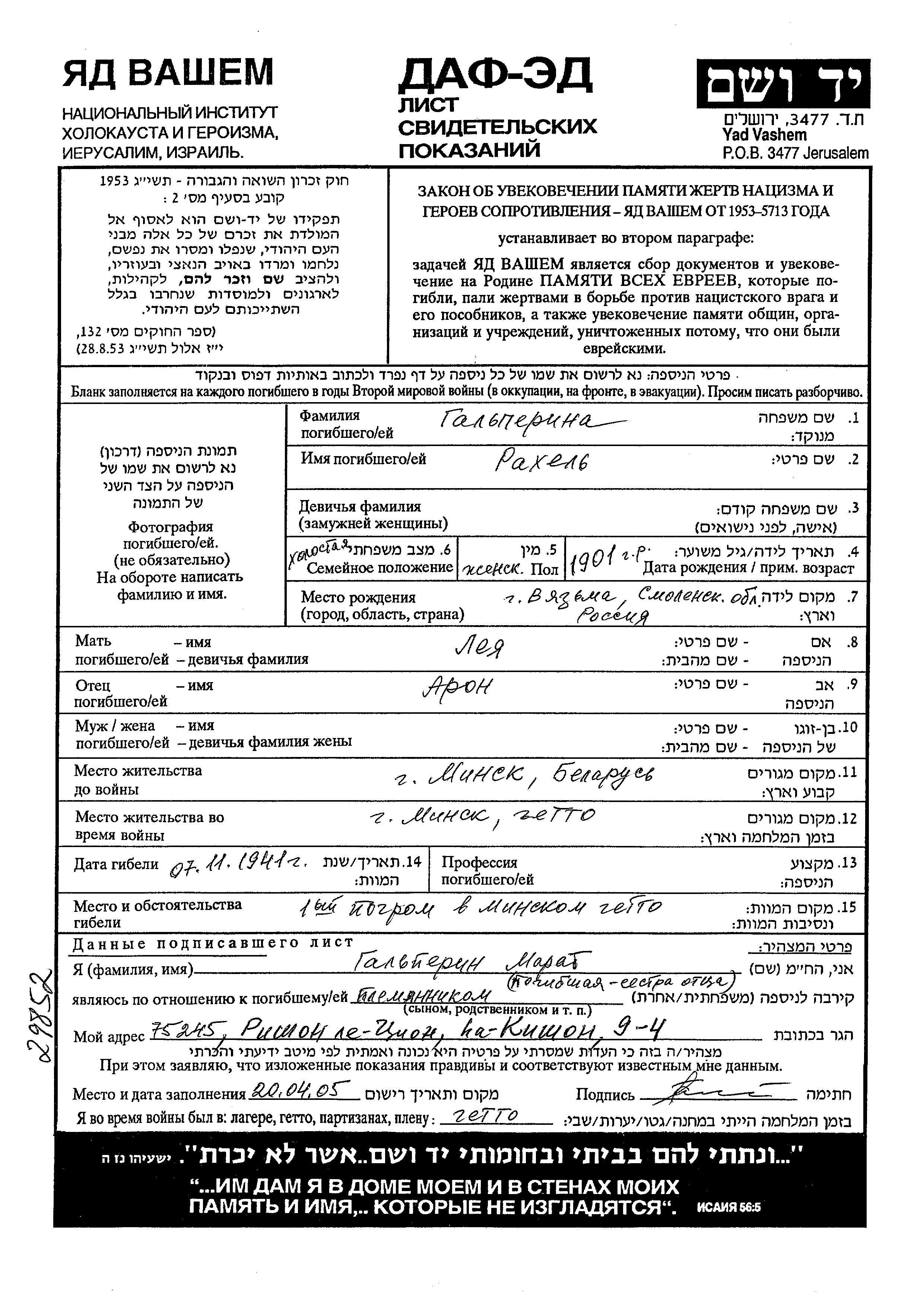 Rakhel Galperina wurde im Jahr 1901 in Vyazma, Russland (UdSSR) geboren. Sie war die Tochter von Aron und Leya. Sie war Ledig. Vor dem Zweiten Weltkrieg lebte sie in Minsk, Weißrussland (UdSSR). Während des Krieges war sie in Minsk, Weißrussland (UdSSR).