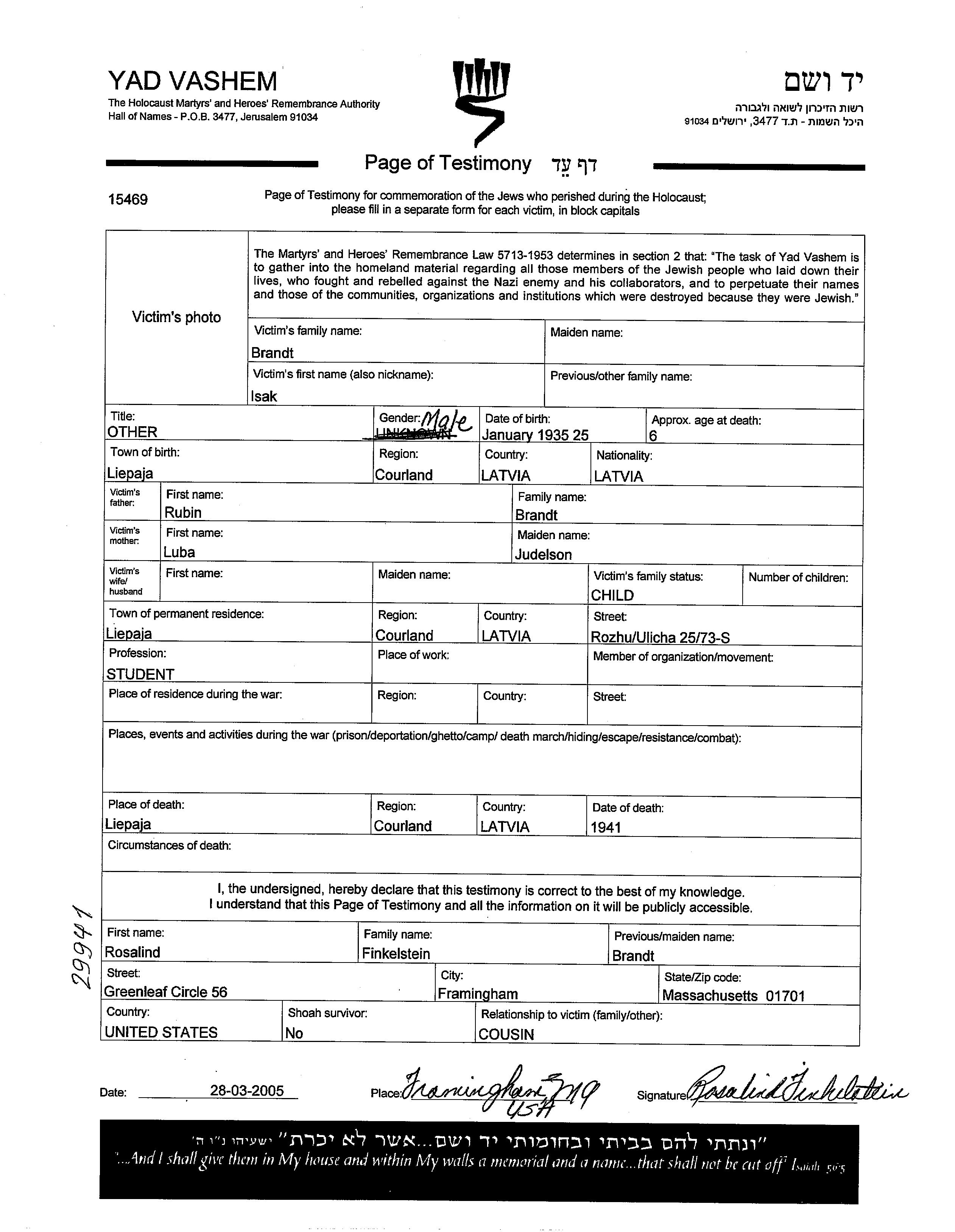 Brandt Isak 1935 Liepaja, Lettland Gedenkblatt (digital, unterzeichnet)