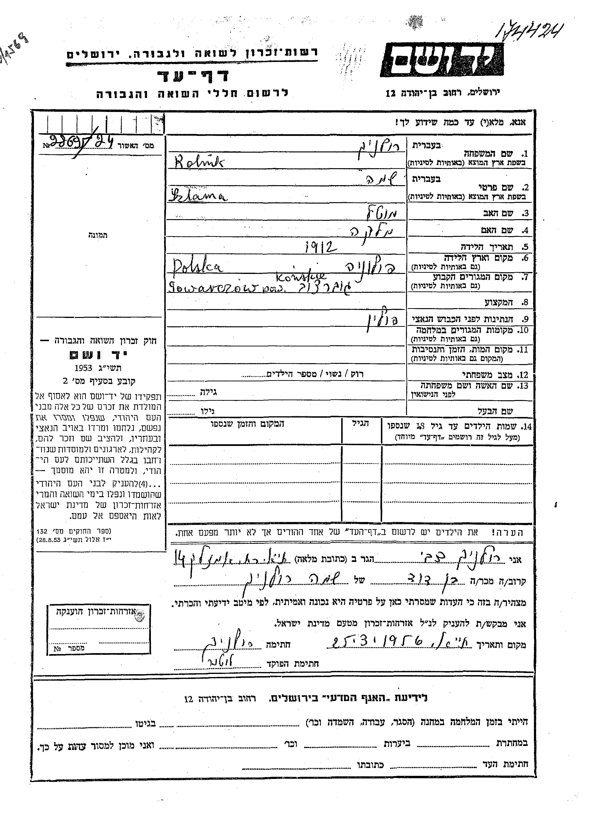 Szlama Shama Rolnik wurde im Jahr 1912 in Polen geboren. Er war der Sohn von Motel und Malka. Vor dem Zweiten Weltkrieg lebte er in Gowarczow, Polen.