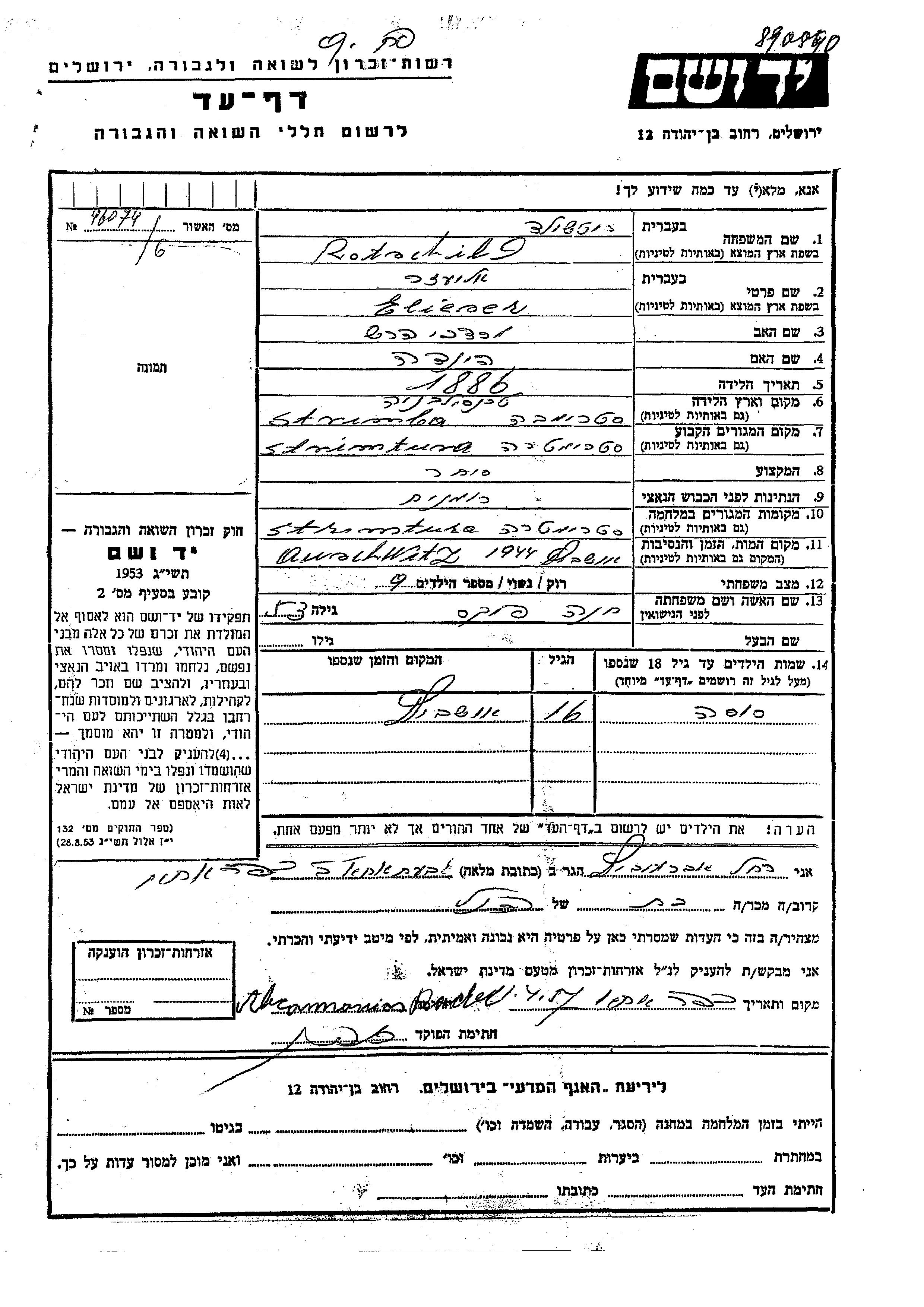 Elieser Rotschild wurde im Jahr 1886 in Strimba, Rumänien geboren. Er war der Sohn von Mordekhai Hersh und Hinda. Er war Kaufmann/-frau und mit Khana, geb. Fiks Verheiratet. Vor dem Zweiten Weltkrieg lebte er in Strimtura, Rumänien. Während des Krieges war er in Strimtura, Rumänien.