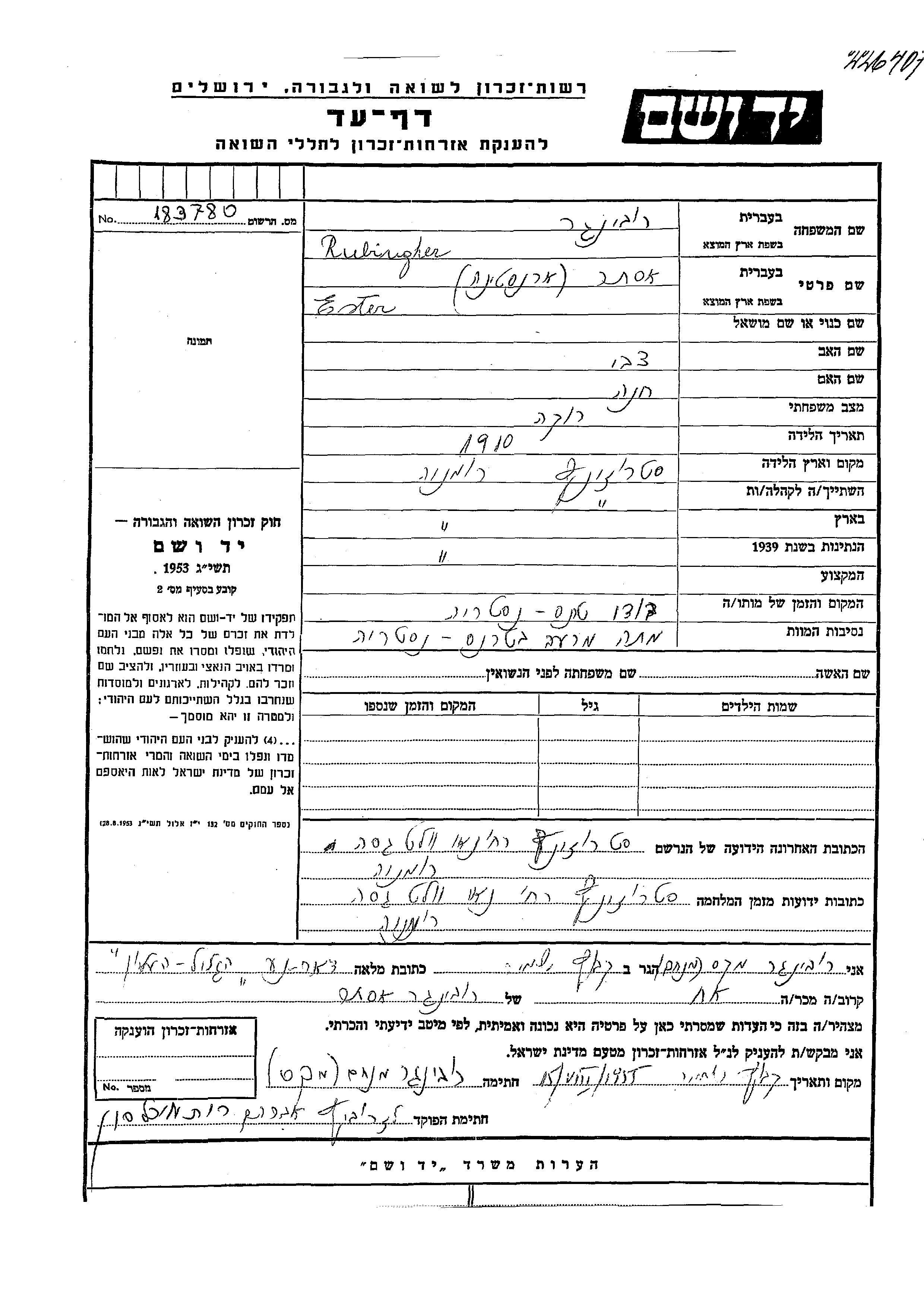 Ester Ernestina Rubingher wurde im Jahr 1910 in Storojinet, Rumänien geboren. Sie war die Tochter von Tzvi und Khana. Sie war Ledig. Vor dem Zweiten Weltkrieg lebte sie in Storojinet, Rumänien. Während des Krieges war sie in Storojinet, Rumänien.