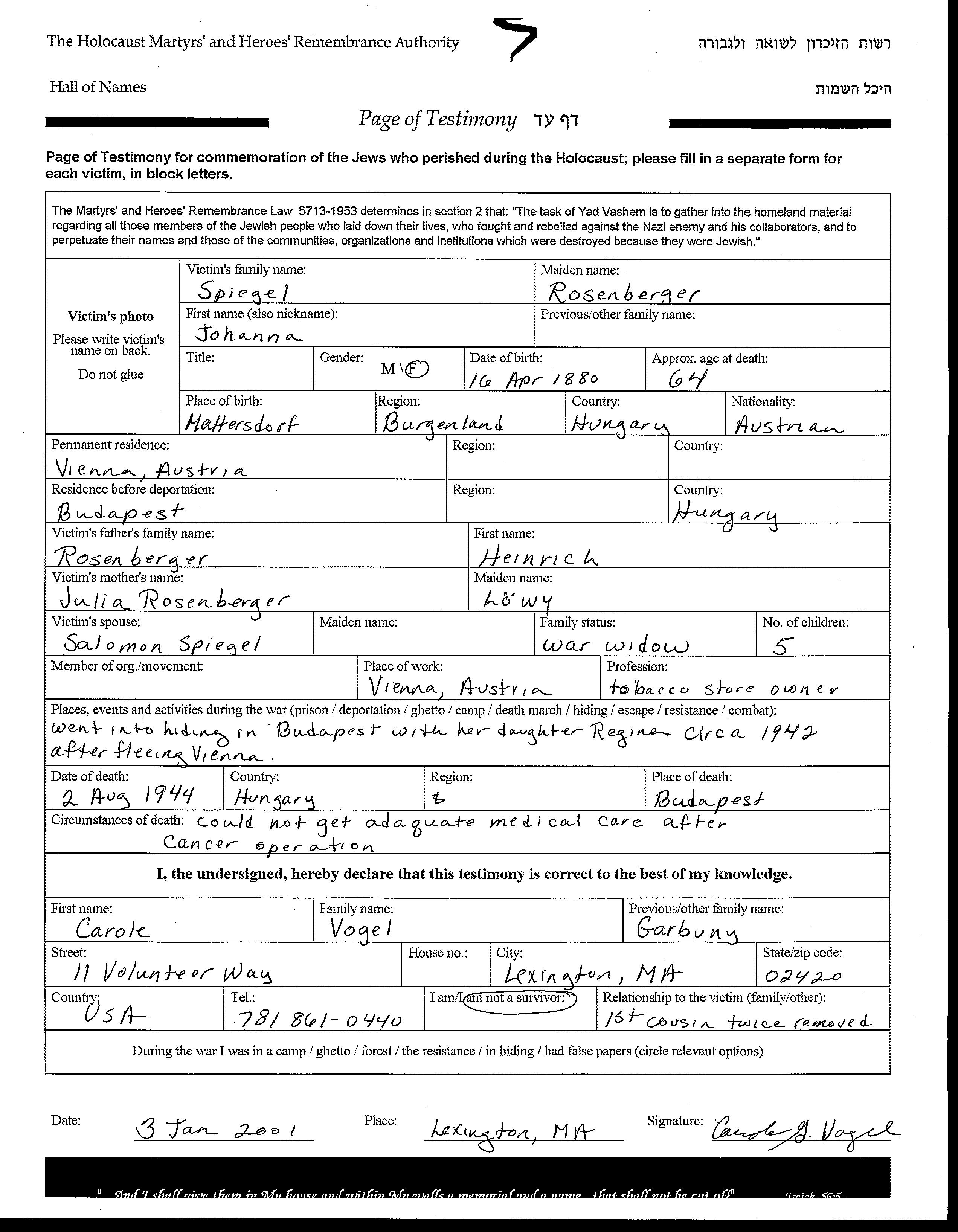 Johanna Spiegel, geb. Rosenberger wurde im Jahr 1880 in Mattersdorf, Österreich geboren. Sie war die Tochter von Heinrich und Julia, geb. Löwy. Sie war mit Salomon, geb. Spiegel Verwitwet. Vor dem Zweiten Weltkrieg lebte sie in Vienna, Österreich. Während des Krieges war sie in Budapest, Ungarn.