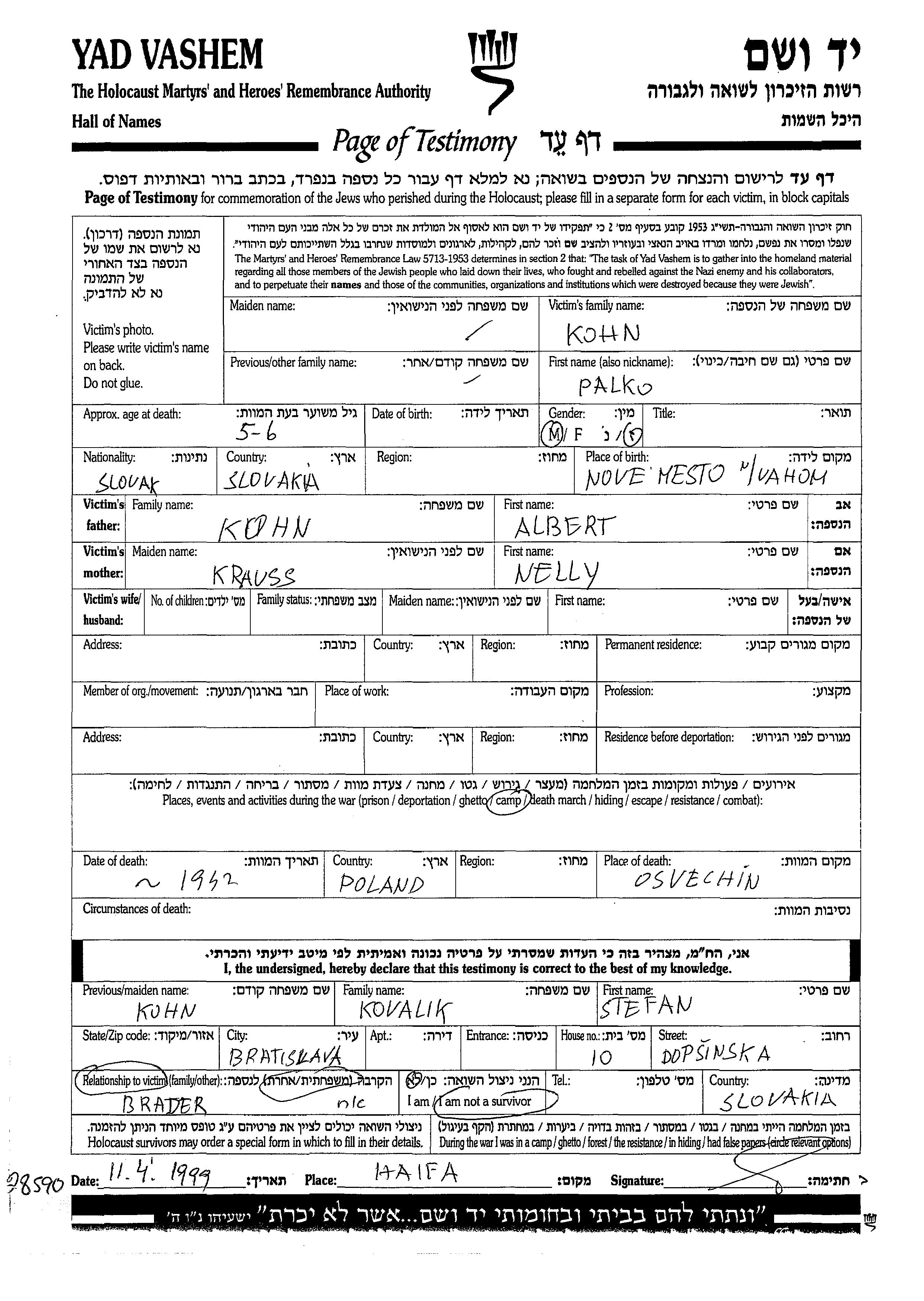 Palko Kohn wurde in Nove Mesto nad Vahom, Tschechoslowakei geboren. Er war der Sohn von Albert und Nelly, geb. Krauss. Während des Krieges war er in Lager.