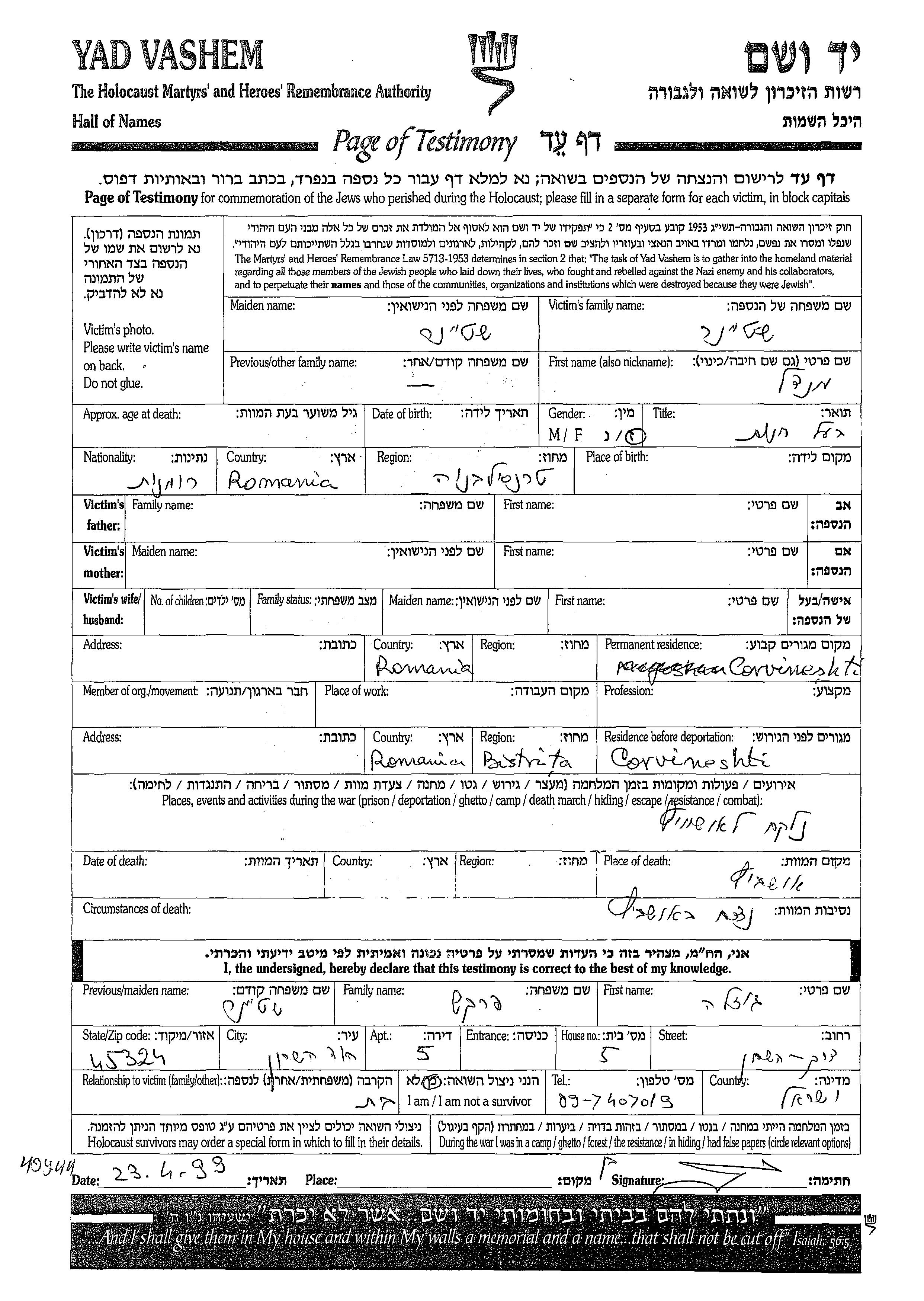Mendel Shteiner wurde in Transylvania, Rumänien geboren. Vor dem Zweiten Weltkrieg lebte er in Corvinesti, Rumänien. Während des Krieges war er in Corvinesti, Rumänien.