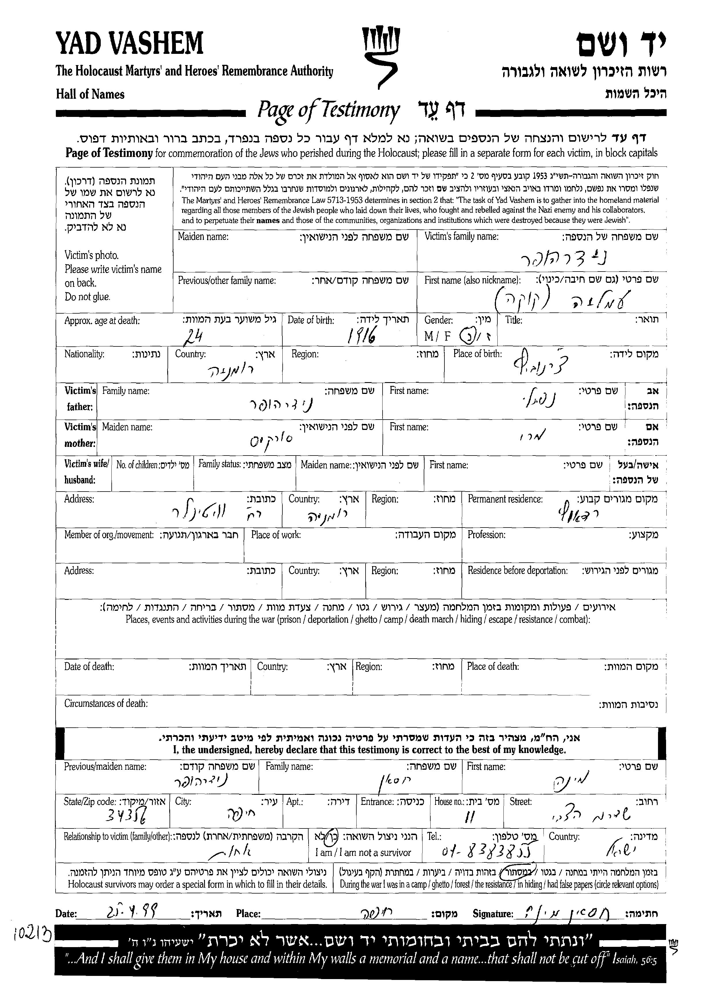 Amalia Koka Niderhofer wurde im Jahr 1916 in Cernautzi, Rumänien geboren. Sie war die Tochter von Naftali und Mari, geb. Surkis. Vor dem Zweiten Weltkrieg lebte sie in Radautz, Rumänien. Während des Krieges war sie in Radautz, Rumänien.
