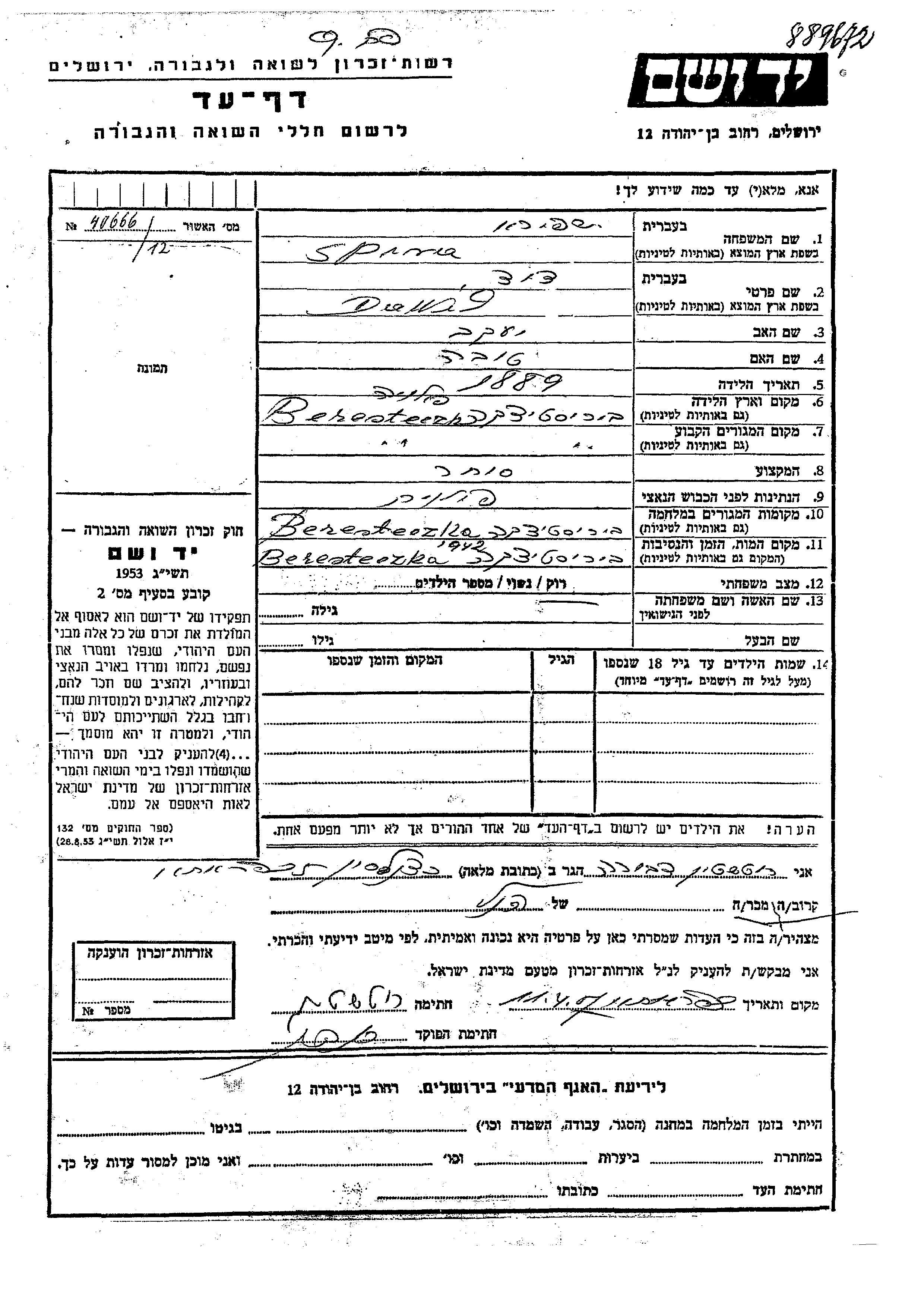 Dawid Spira wurde im Jahr 1889 in Beresteczko, Polen geboren. Er war der Sohn von Yaakov und Tova. Er war Kaufmann/-frau und Ledig. Vor dem Zweiten Weltkrieg lebte er in Beresteczko, Polen. Während des Krieges war er in Beresteczko, Polen.