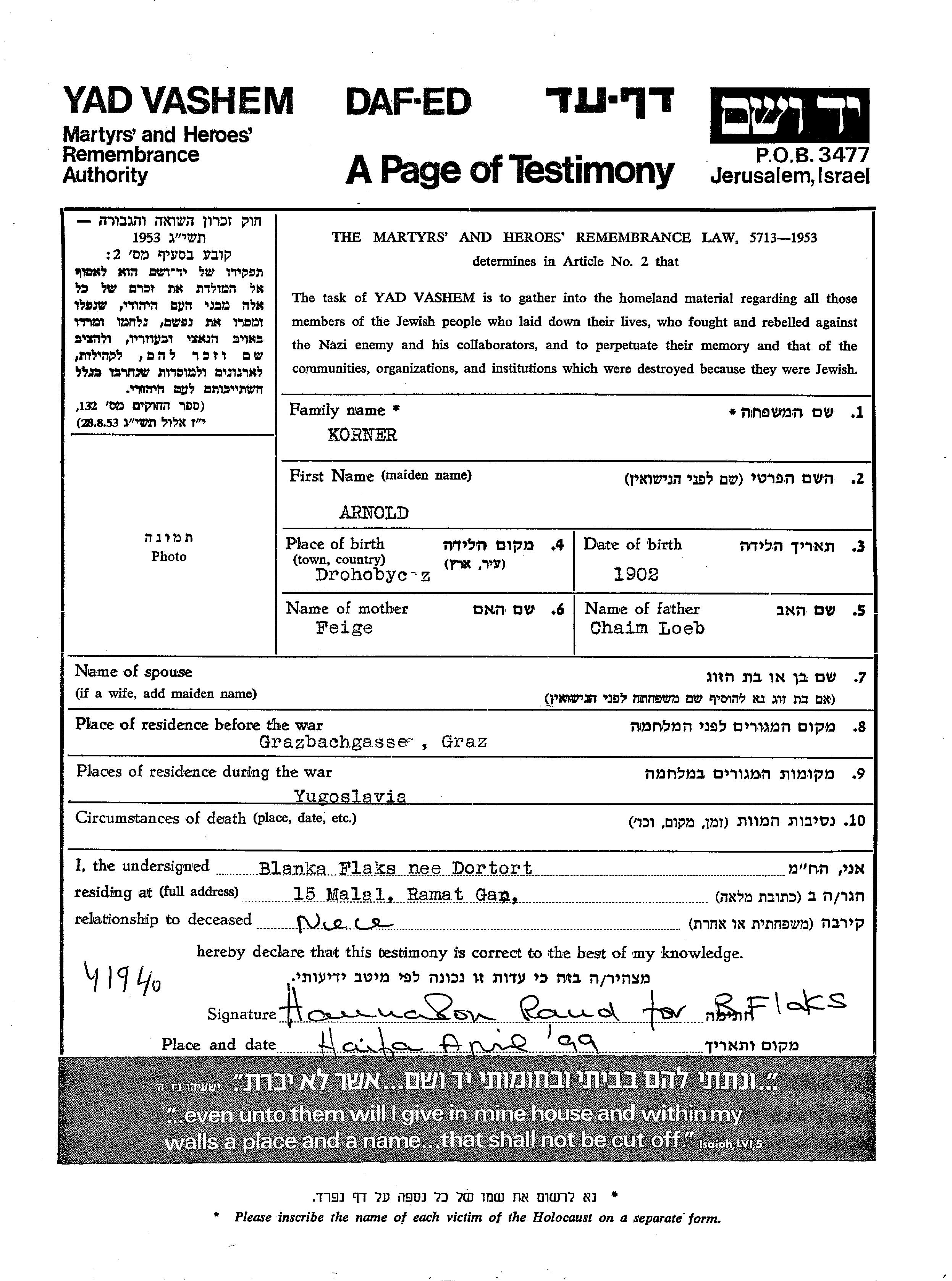 Arnold Korner wurde im Jahr 1902 in Drohobycz, Polen geboren. Er war der Sohn von Chaim Löb und Feige. Vor dem Zweiten Weltkrieg lebte er in Graz, Österreich. Während des Krieges war er in Jugoslawien.
