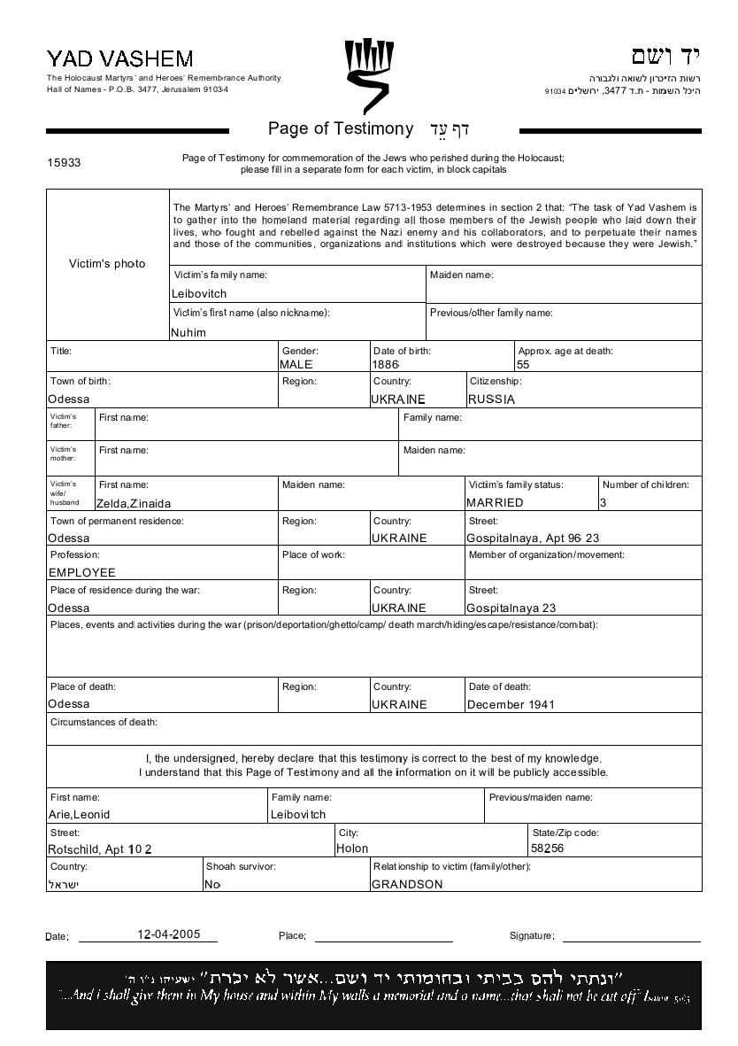 Nuhim Leibovitch wurde im Jahr 1886 in Odessa, Ukraine (UdSSR) geboren. Er war mit Zelda Zinaida Verheiratet. Vor dem Zweiten Weltkrieg lebte er in Odessa, Ukraine (UdSSR). Während des Krieges war er in Odessa, Ukraine (UdSSR).