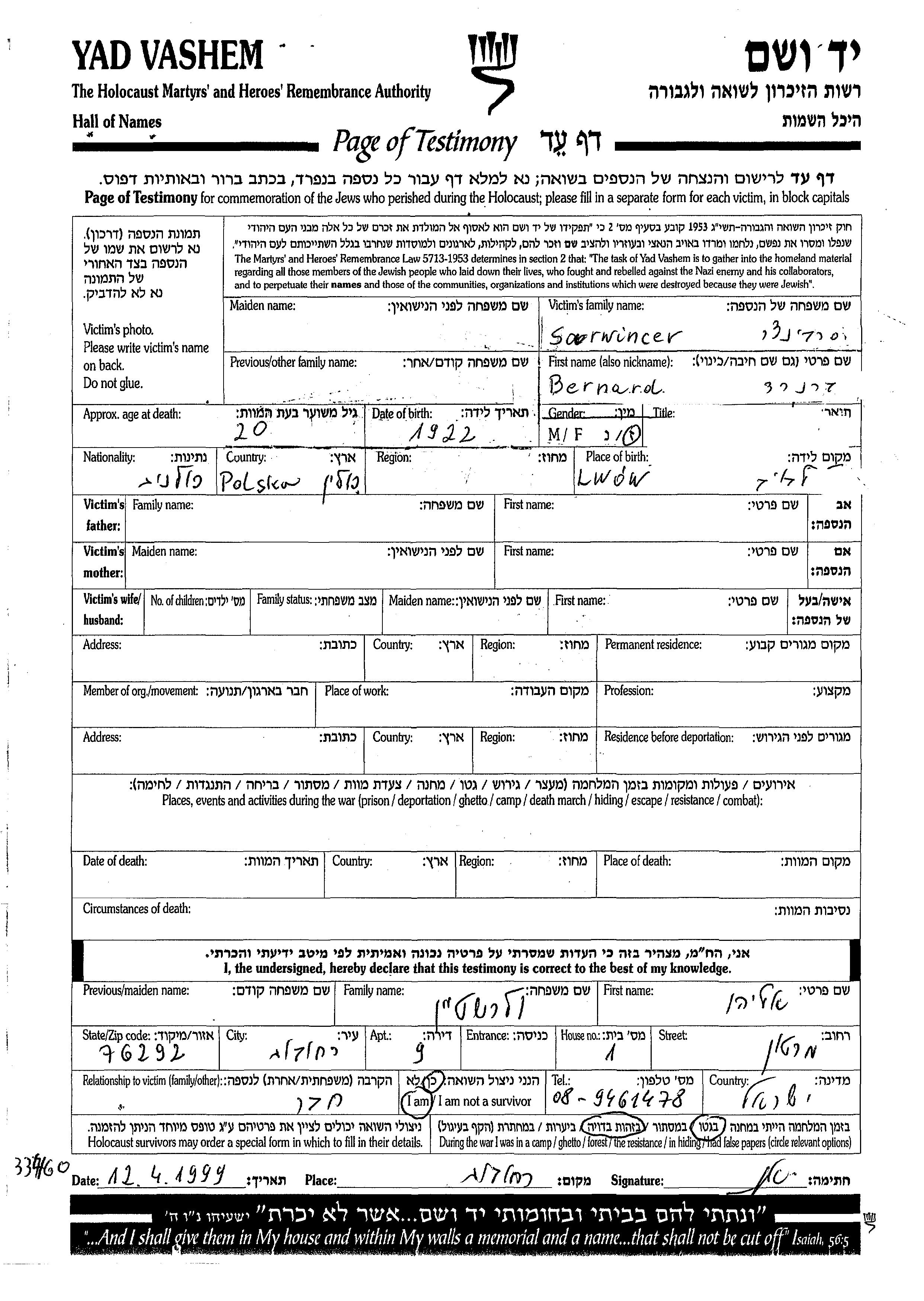 Bernard Sarvintzer wurde im Jahr 1922 in Lwow, Polen geboren.