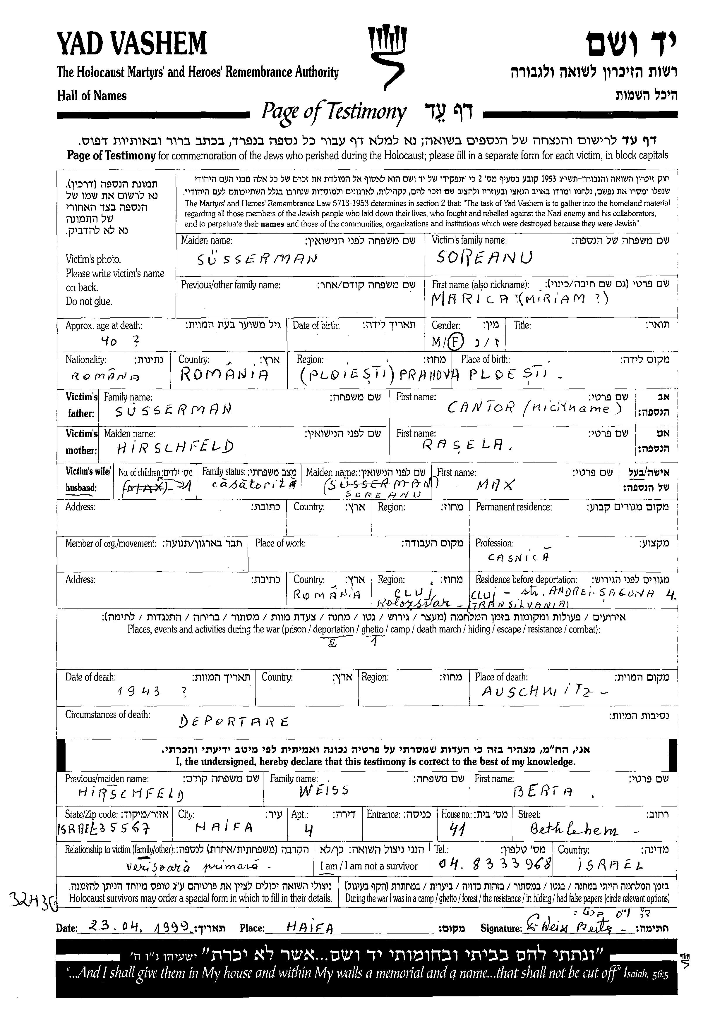 Miriam Marica Soreanu, geb. Suessermann Susserman wurde in Ploiesti, Rumänien geboren. Sie war die Tochter von Rasela, geb. Hirschfeld. Sie war mit Max Verheiratet. Während des Krieges war sie in Cluj, Rumänien.