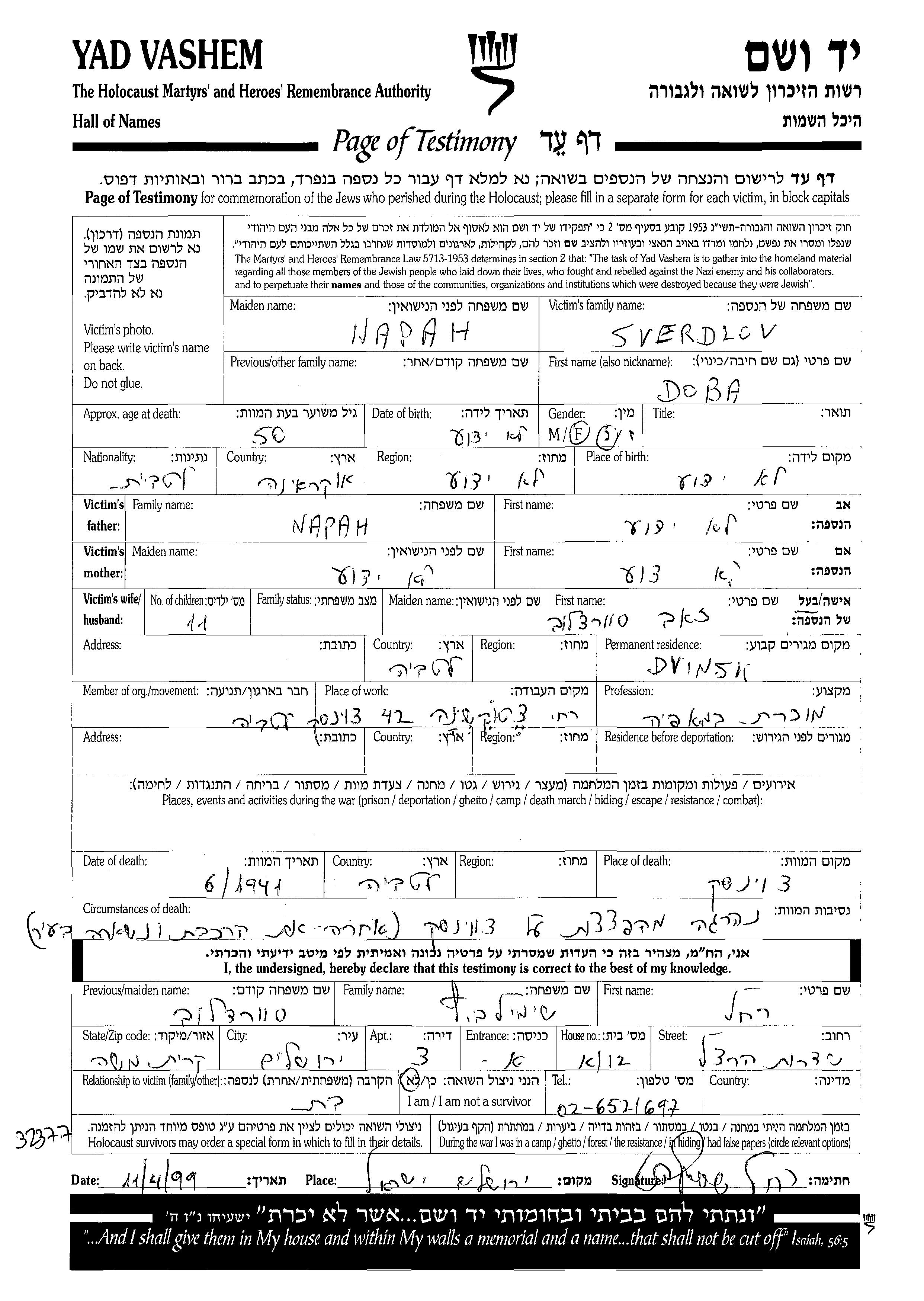 Doba Sverdlov, geb. Napah wurde in Ukraine (UdSSR) geboren. Vor dem Zweiten Weltkrieg lebte sie in Dvinsk, Lettland. Während des Krieges war sie in Dvinsk, Lettland.
