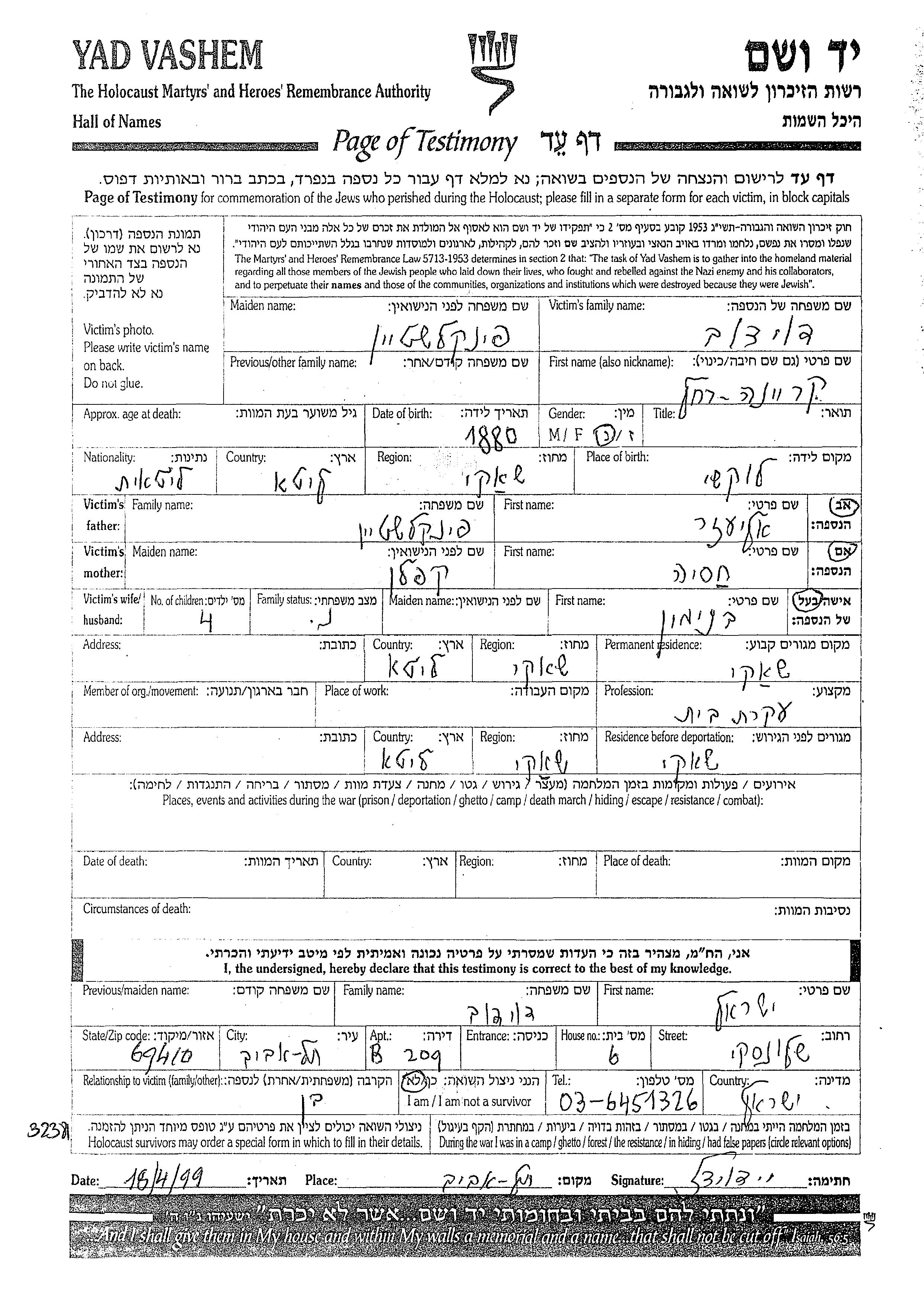 Kreina Rakhel Davidov, geb. Finkelshtein wurde im Jahr 1880 in Luksiai, Litauen geboren. Sie war die Tochter von Eliezer und Khasia, geb. Kaplan. Sie war mit Beniamin Verheiratet. Vor dem Zweiten Weltkrieg lebte sie in Sakiai, Litauen. Während des Krieges war sie in Sakiai, Litauen.