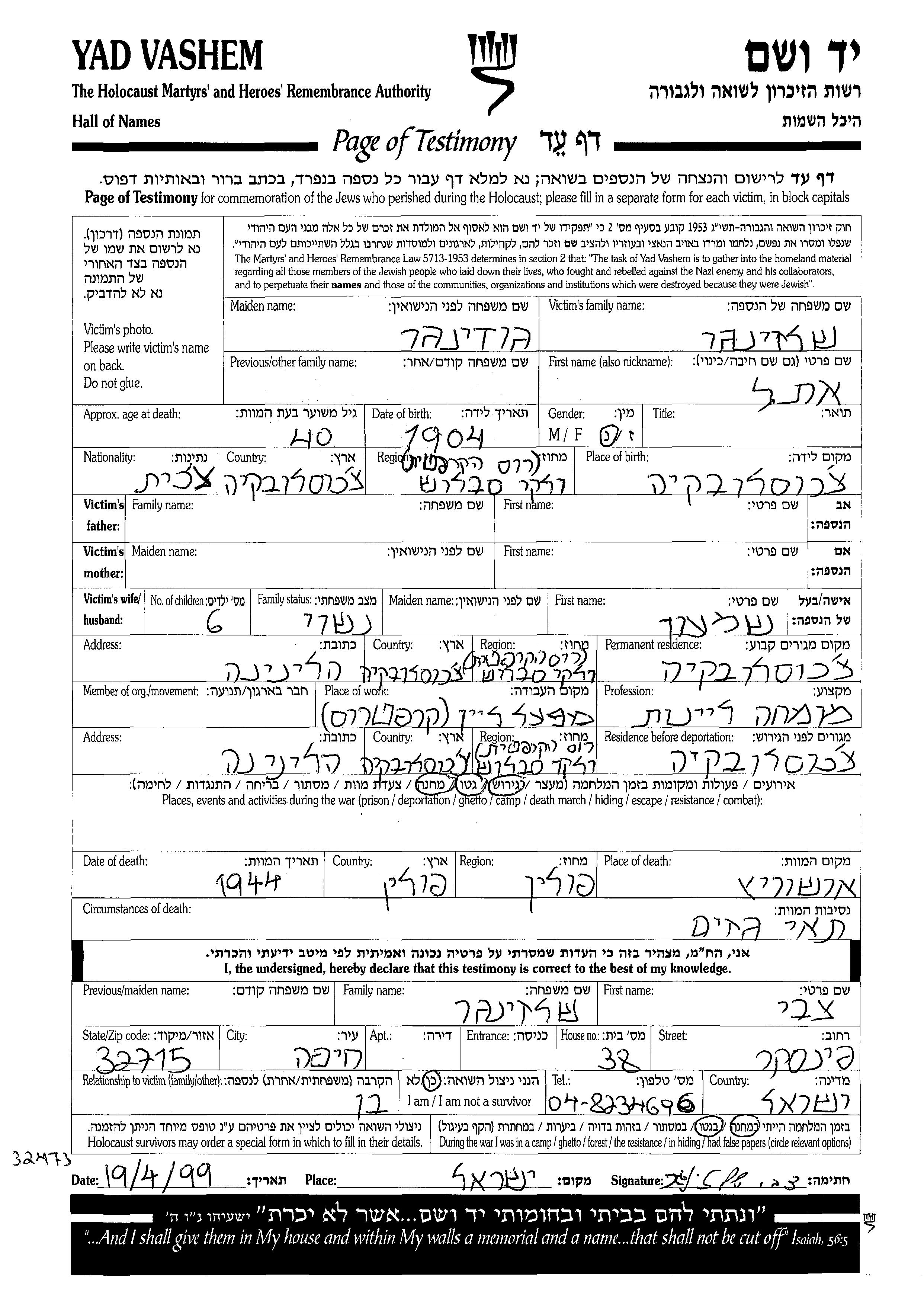 Etel Shlezinger, geb. Godinger wurde im Jahr 1904 in Velky Sevlus, Tschechoslowakei geboren. Sie war mit Shimon Verheiratet. Vor dem Zweiten Weltkrieg lebte sie in Velky Sevlus, Tschechoslowakei. Während des Krieges war sie in Getto.