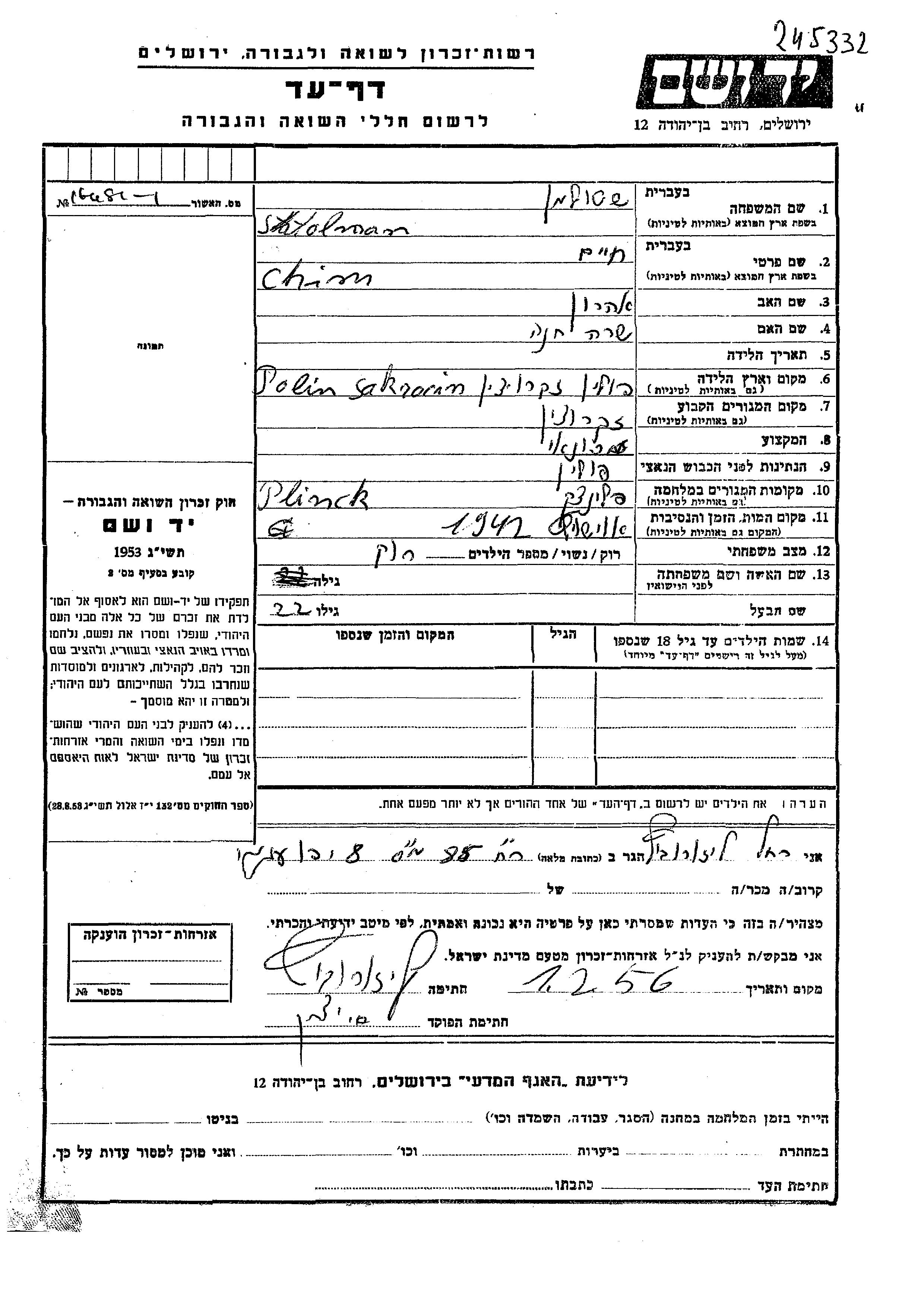 Chim Stolman Shtulman wurde in Zakroczyn, Polen geboren. Er war der Sohn von Aharon und Sara Khana. Er war Mechaniker/-in und Ledig. Vor dem Zweiten Weltkrieg lebte er in Zakrochim, Polen. Während des Krieges war er in Plintsk, Polen.
