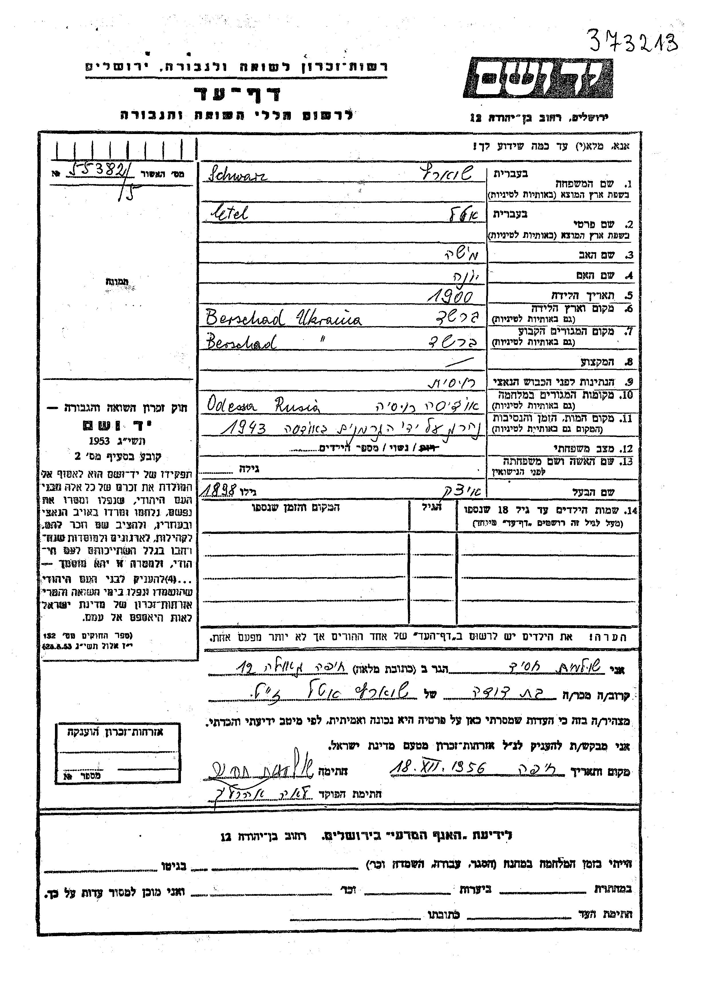 Etel Schwarz wurde im Jahr 1900 in Bershad, Ukraine (UdSSR) geboren. Sie war die Tochter von Moshe und Yona. Sie war mit Itzek Verheiratet. Vor dem Zweiten Weltkrieg lebte sie in Bershad, Ukraine (UdSSR). Während des Krieges war sie in Odessa, Ukraine (UdSSR).