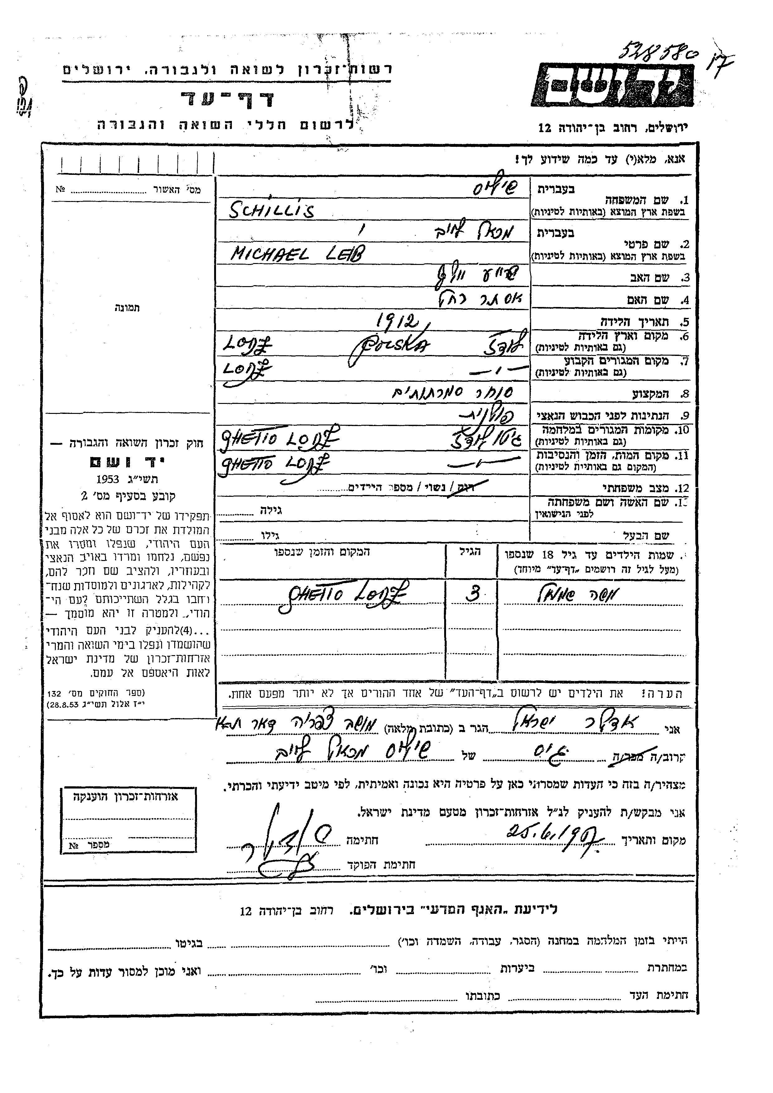 Michael Leib Schillis wurde im Jahr 1912 in Lodz, Polen geboren. Er war der Sohn von Shiye Volf und Ester Rakhel. Er war Lumpenhändler und Verheiratet. Vor dem Zweiten Weltkrieg lebte er in Lodz, Polen. Während des Krieges war er in Lodz, Polen.