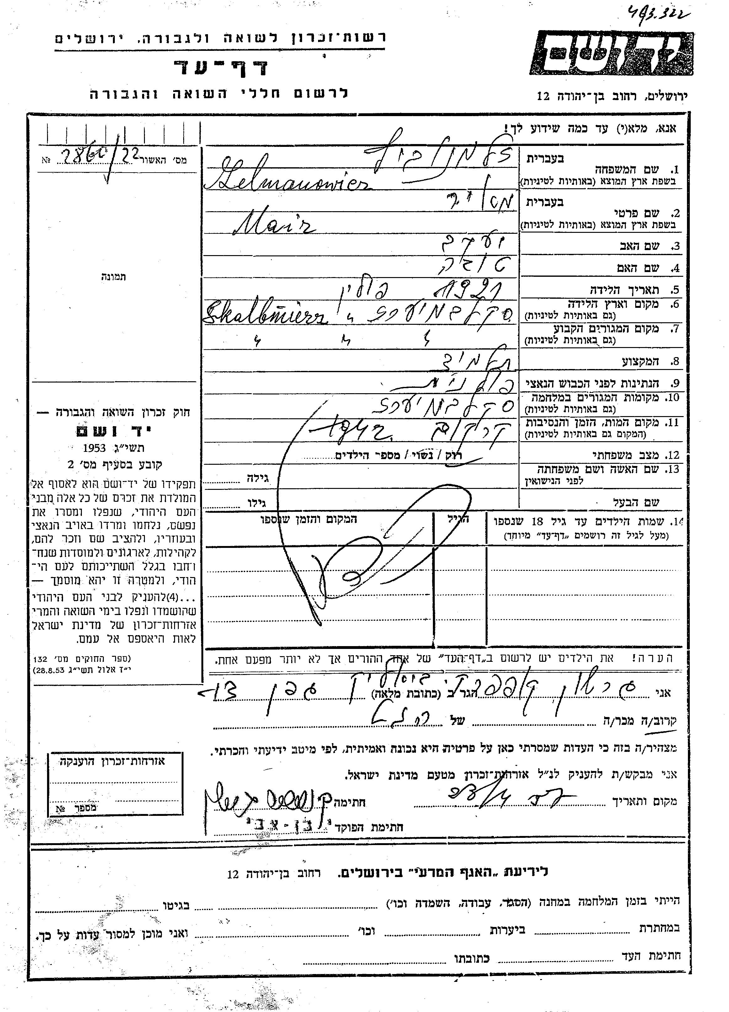Mair Zelmanowicz wurde im Jahr 1921 in Skalbmierz, Polen geboren. Er war der Sohn von Yaakov und Tova. Er war Schüler/-in und Ledig. Vor dem Zweiten Weltkrieg lebte er in Skalbmierz, Polen. Während des Krieges war er in Skalbmierz, Polen.