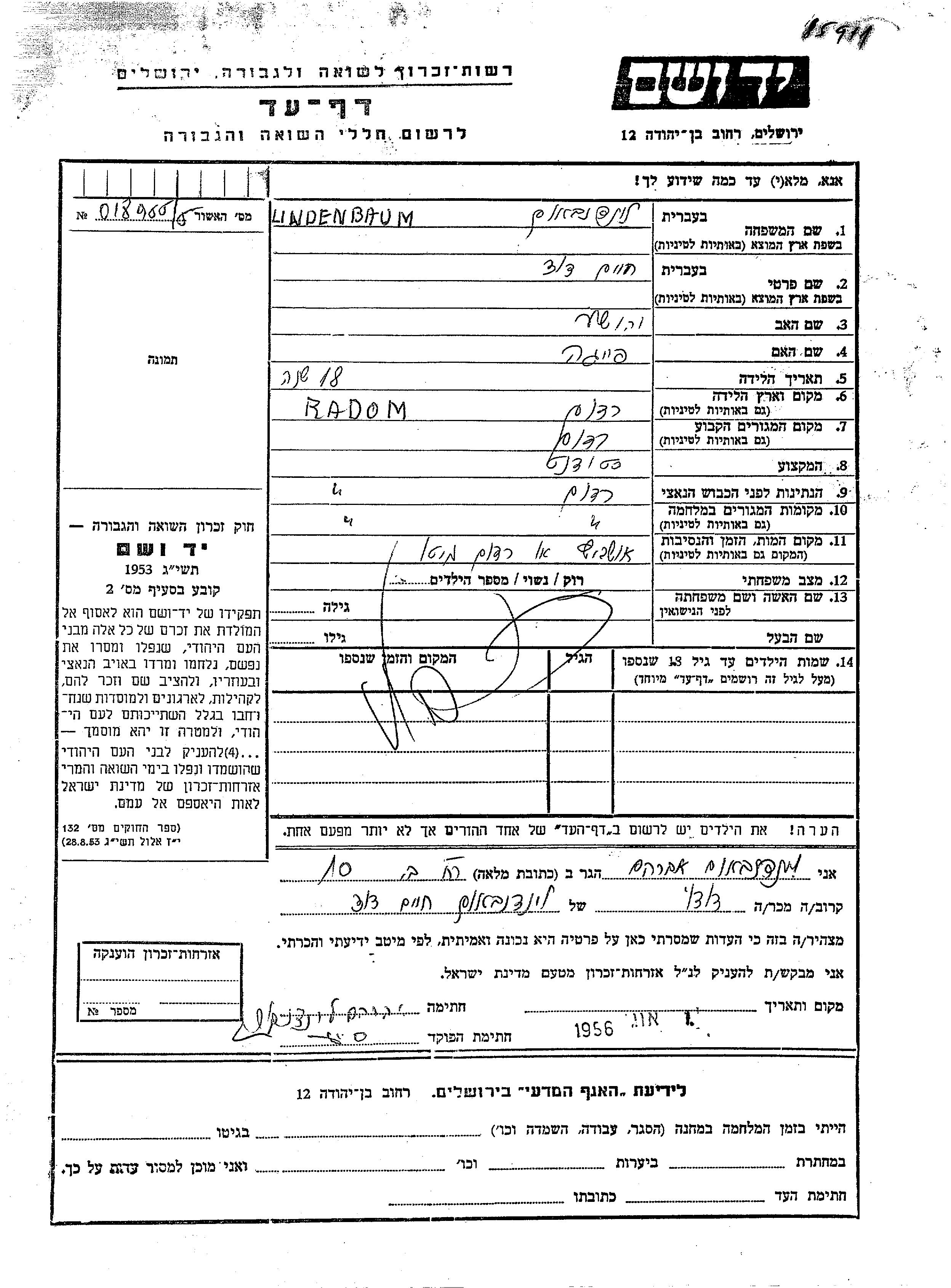 Khaim David Lindenbaum wurde in Radom, Polen geboren. Er war der Sohn von Yehoshua und Feiga. Er war Student. Vor dem Zweiten Weltkrieg lebte er in Radom, Polen. Während des Krieges war er in Radom, Polen.