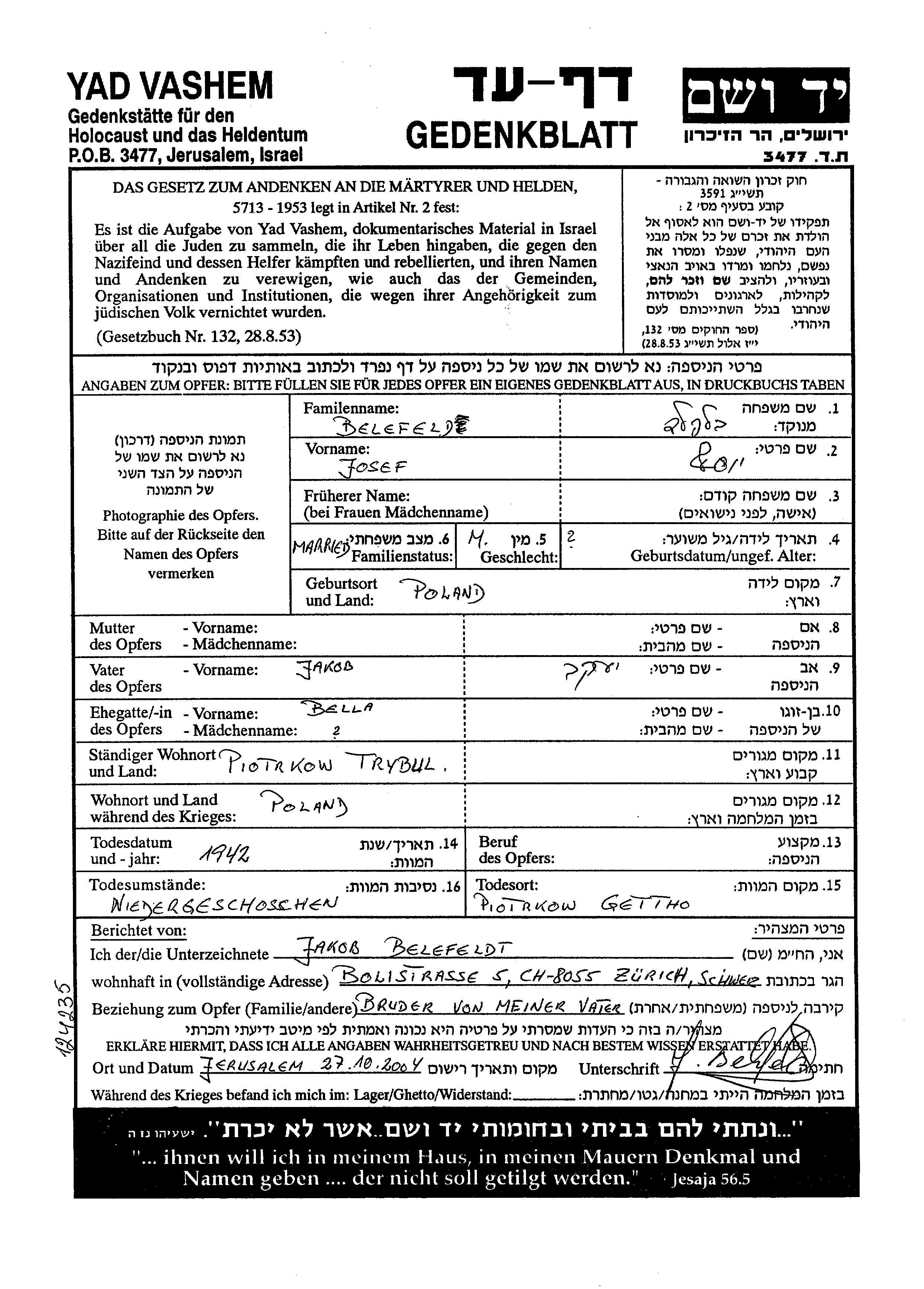 Yosef wurde in der Schoah ermordet. Todesort: Piotrkow, Polen im Jahr 1942.