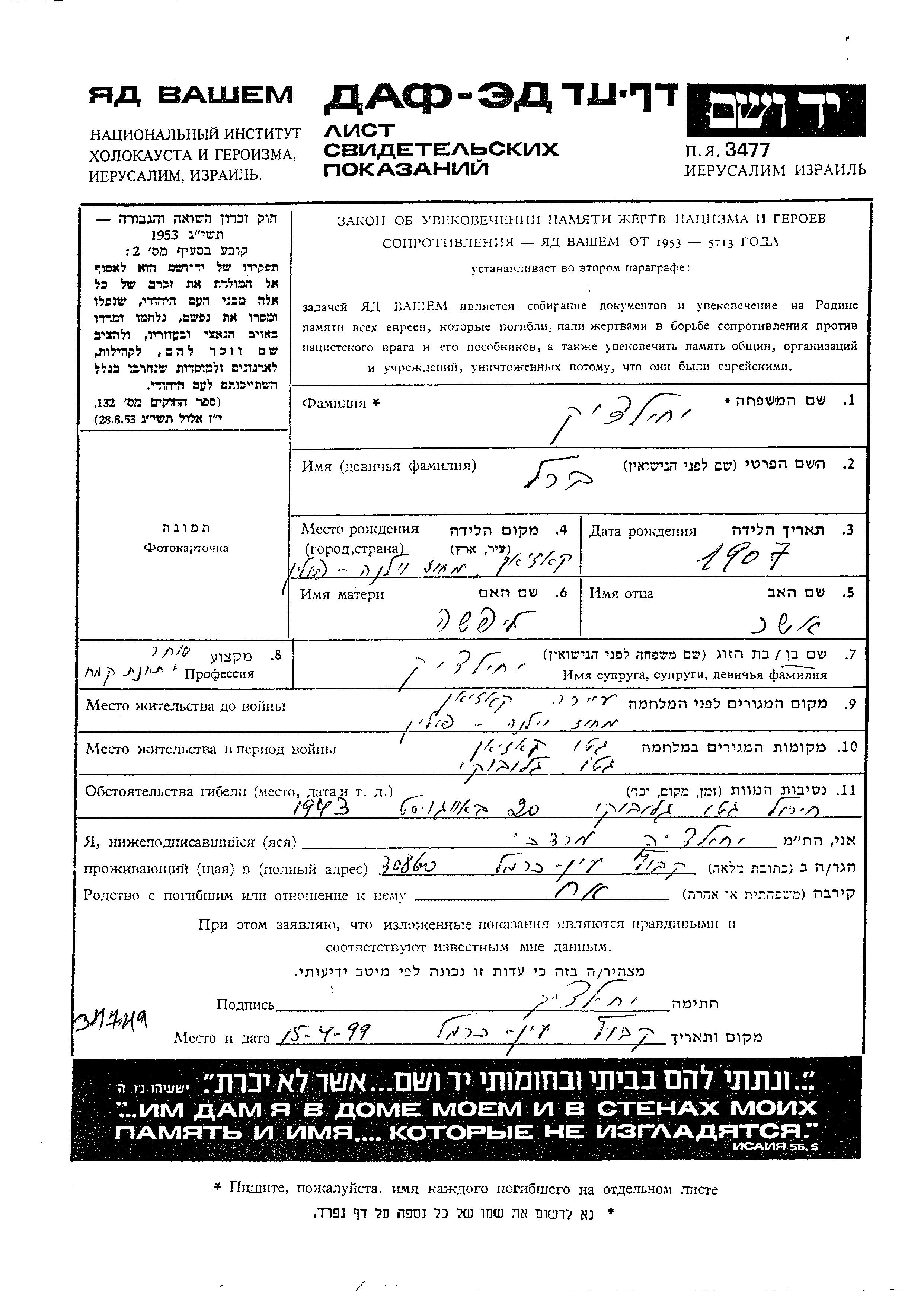 Berl Iekhilchik wurde im Jahr 1907 in Kozyn, Polen geboren. Er war der Sohn von Asher und Lifsha. Er war Mühlenarbeiter und Verheiratet. Vor dem Zweiten Weltkrieg lebte er in Kozyn, Polen. Während des Krieges war er in Kozyn, Polen.