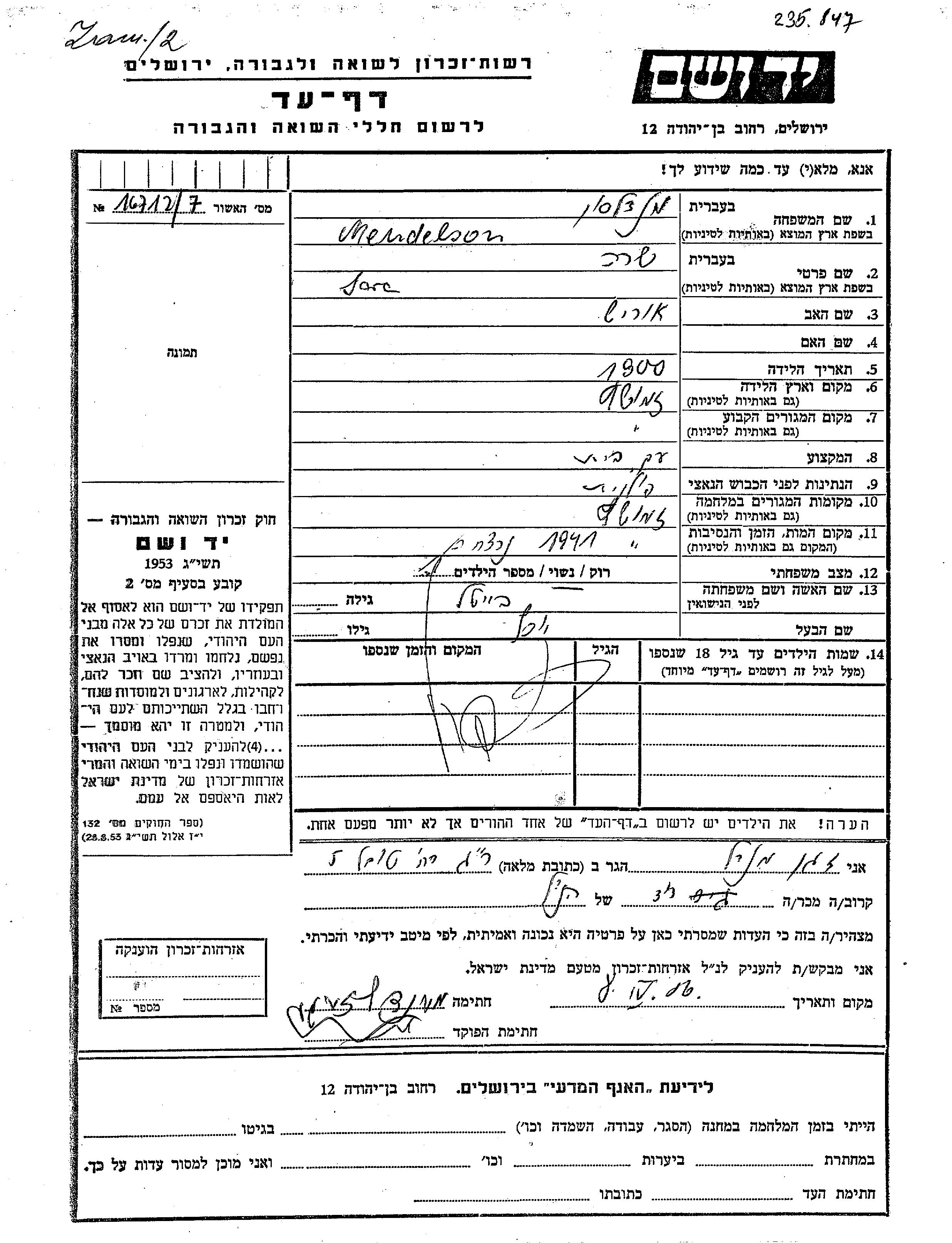 Sara Mendelson, geb. Beitel wurde im Jahr 1900 in Zamosc, Polen geboren. Sie war die Tochter von Urish. Sie war Hausfrau und mit Yosef Verheiratet. Vor dem Zweiten Weltkrieg lebte sie in Zamosc, Polen. Während des Krieges war sie in Zamosc, Polen.