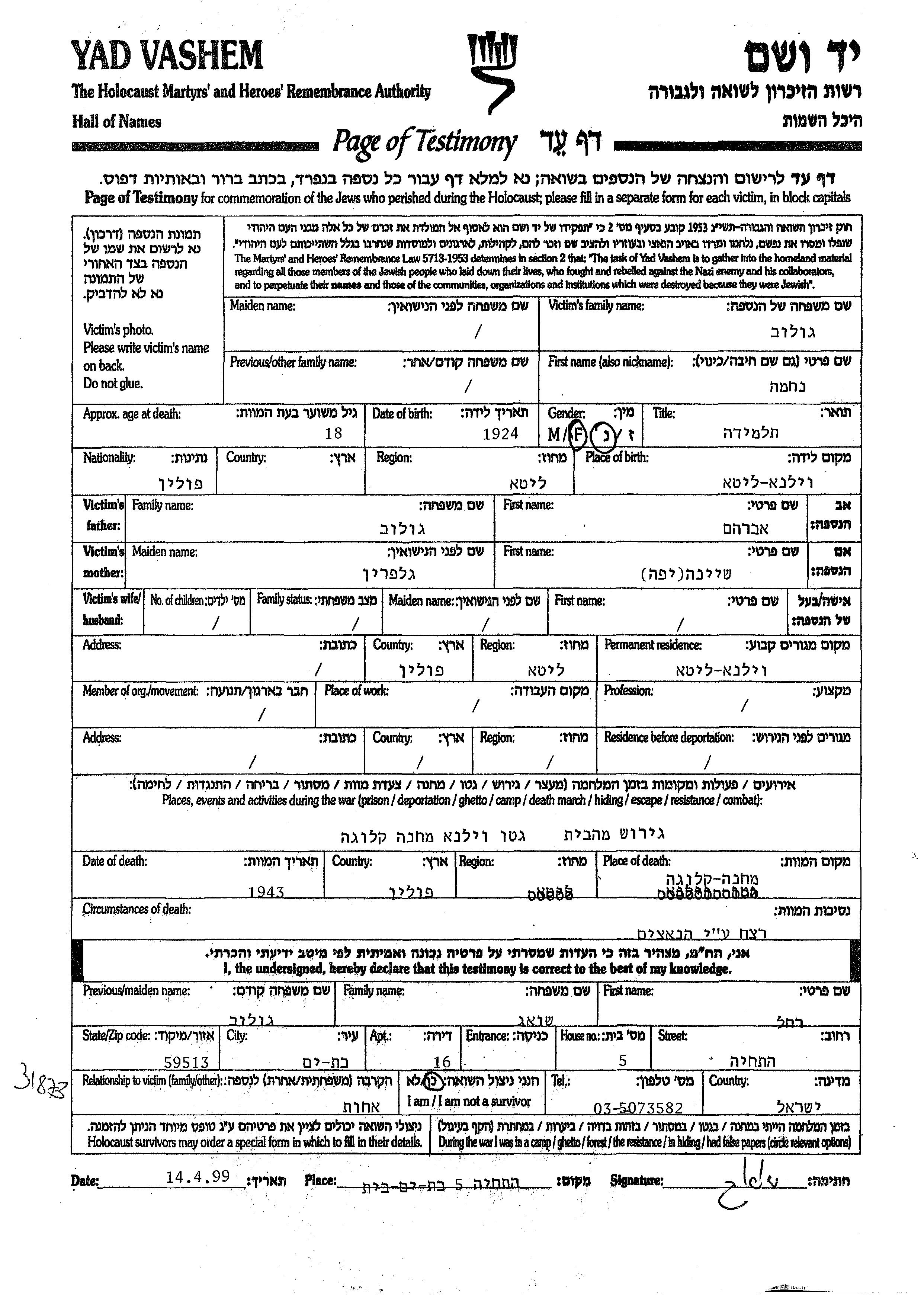 Nekhama Golub wurde im Jahr 1924 in Wilno, Polen geboren. Sie war die Tochter von Avraham und Sheina Yafa, geb. Galperin. Sie war Ledig. Vor dem Zweiten Weltkrieg lebte sie in Wilno, Polen. Während des Krieges war sie in Wilno, Polen.