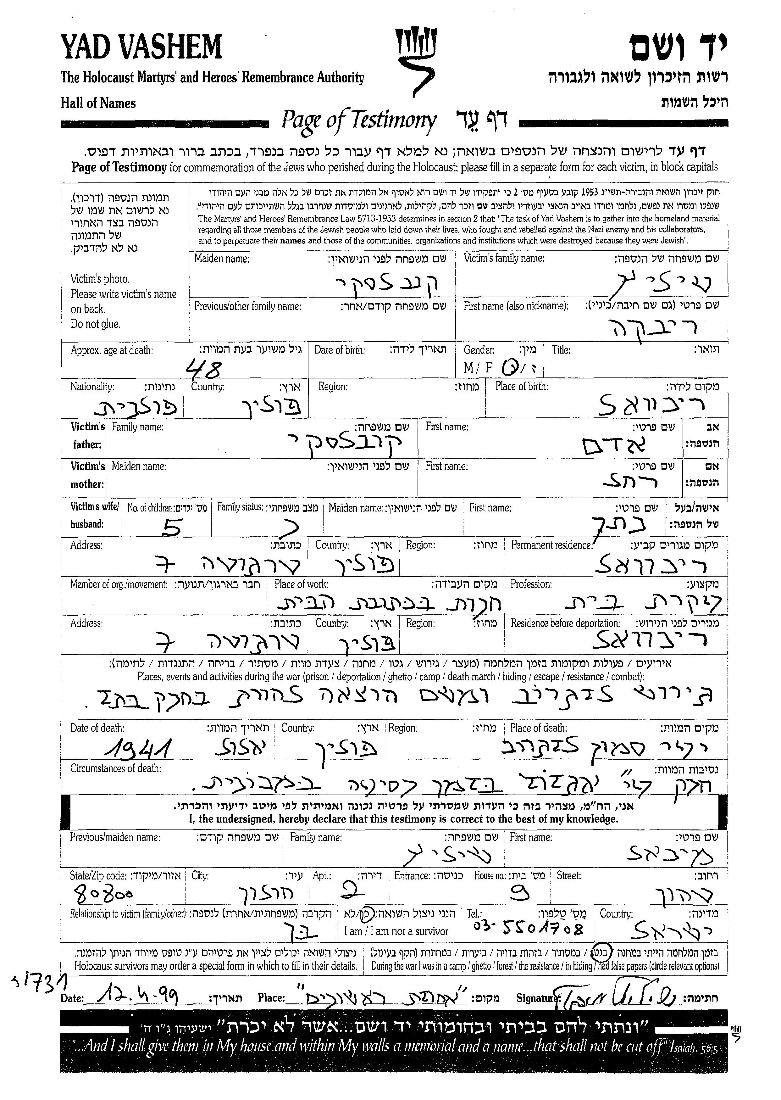 Rivka Shilitz, geb. Kobelski wurde in Rychwal, Polen geboren. Sie war die Tochter von Adam und Rakhel. Sie war Hausfrau und mit Natan Verheiratet. Vor dem Zweiten Weltkrieg lebte sie in Rychwal, Polen. Während des Krieges war sie in Rychwal, Polen.