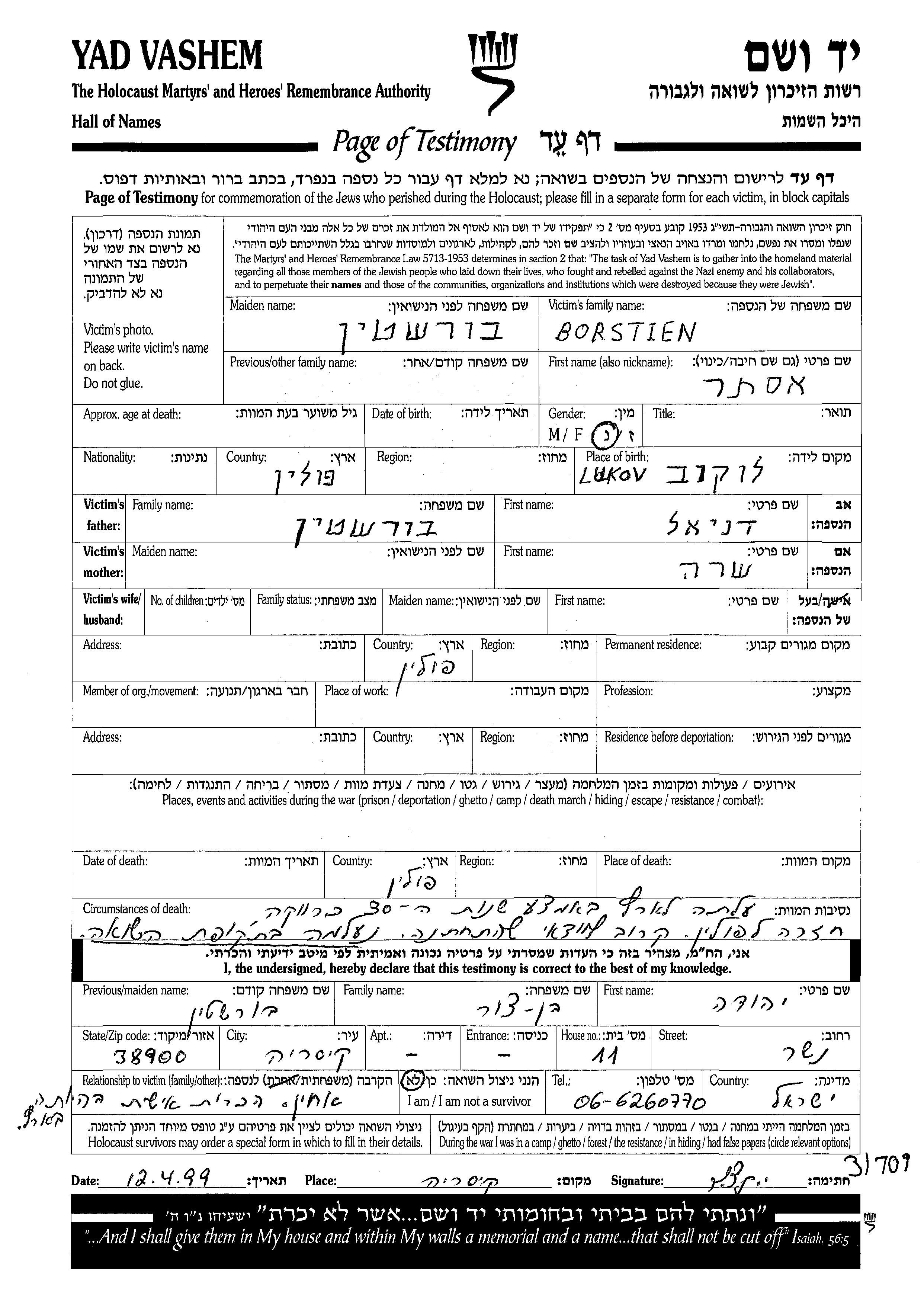 Ester Name unbekannt, geb. Borstein wurde in Lukow, Polen geboren. Sie war die Tochter von Daniel und Sara. Sie war Verheiratet. Vor dem Zweiten Weltkrieg lebte sie in Polen. Während des Krieges war sie in Polen.